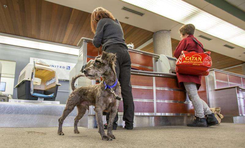 Doctor, a 7-year-old schnauzer, waits to check in Sept. 29 at the Durango-La Plata County Airport as he is held by La Plata County Humane Society Board member and volunteer Cathy Roberts. He was flying to Cincinnati to be returned to family. Photo by Shaun Stanley/Durango Herald