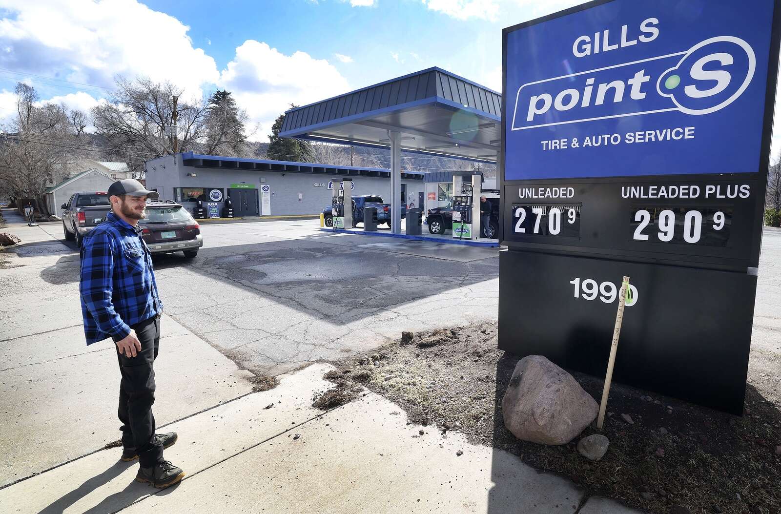 Casey McVay, manager of Gills Point S Tire & Auto Service, talks about how much easier it is changing the gas prices on the new sign compared to going up about 20 feet on a ladder to change prices when it was Peerless Tyre Co. Gills Point S purchased the Peerless company and its 54 locations, taking over the Durango store on Main Avenue that had been under the Peerless name for 38 years. The new business now offers full auto service along with adding new brands of tires. More changes are planned in the future. (Jerry McBride/Durango Herald)