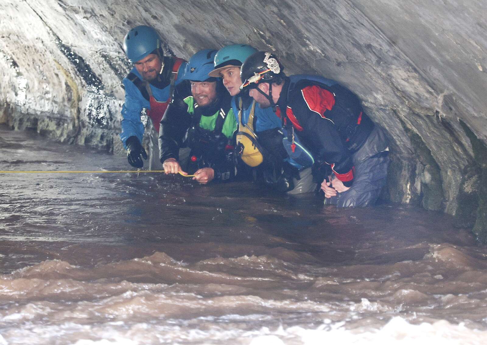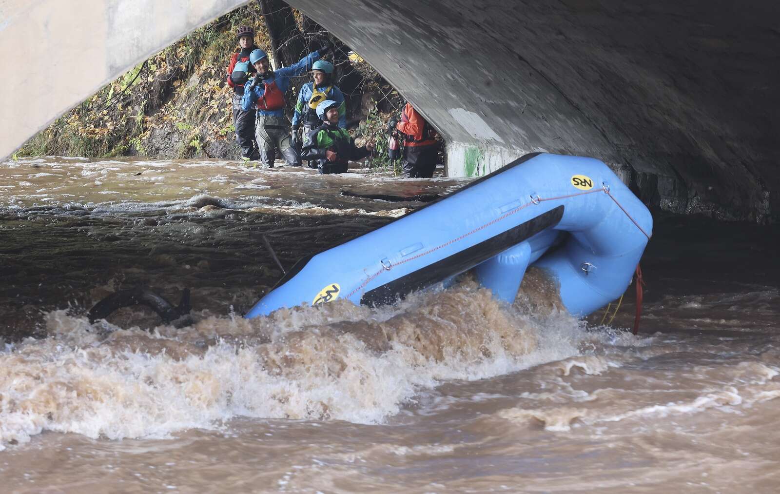 Boaters try to free their raft Tuesday afternoon after getting hung up on debris while rafting the high water flow at the Main Avenue Bridge on the Animas River. (Jerry McBride/Durango Herald)