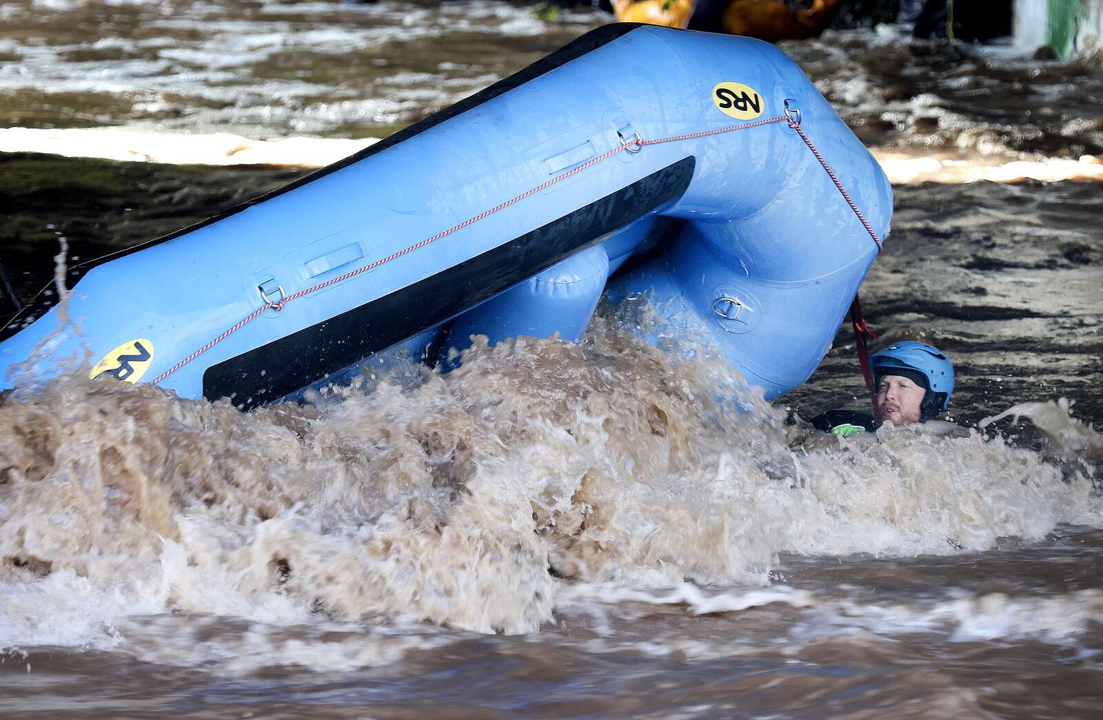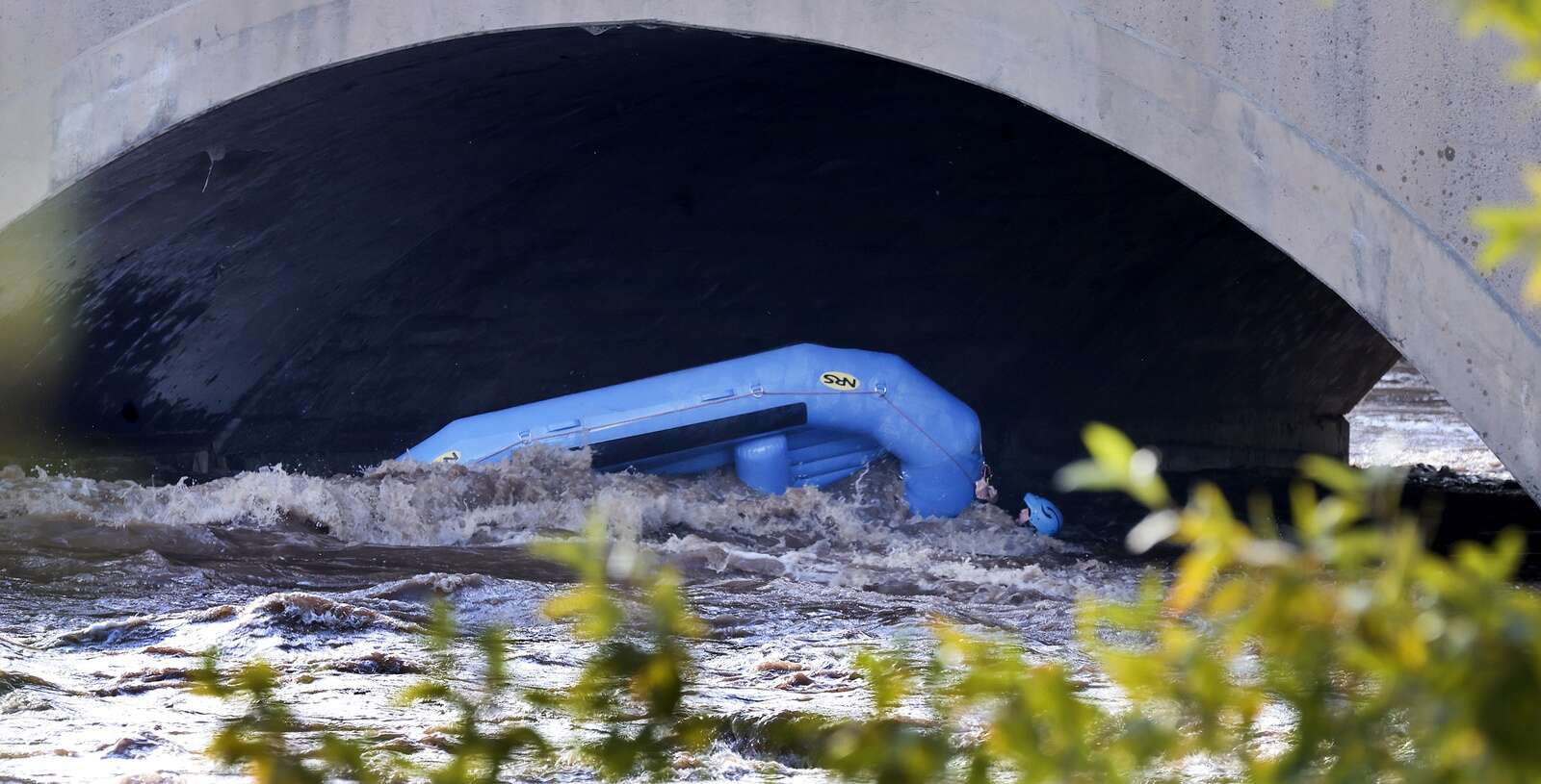 A boater tries to free his raft Tuesday afternoon after getting hung up on debris at the Main Avenue Bridge while rafting the high water flow on the Animas River. (Jerry McBride/Durango Herald)