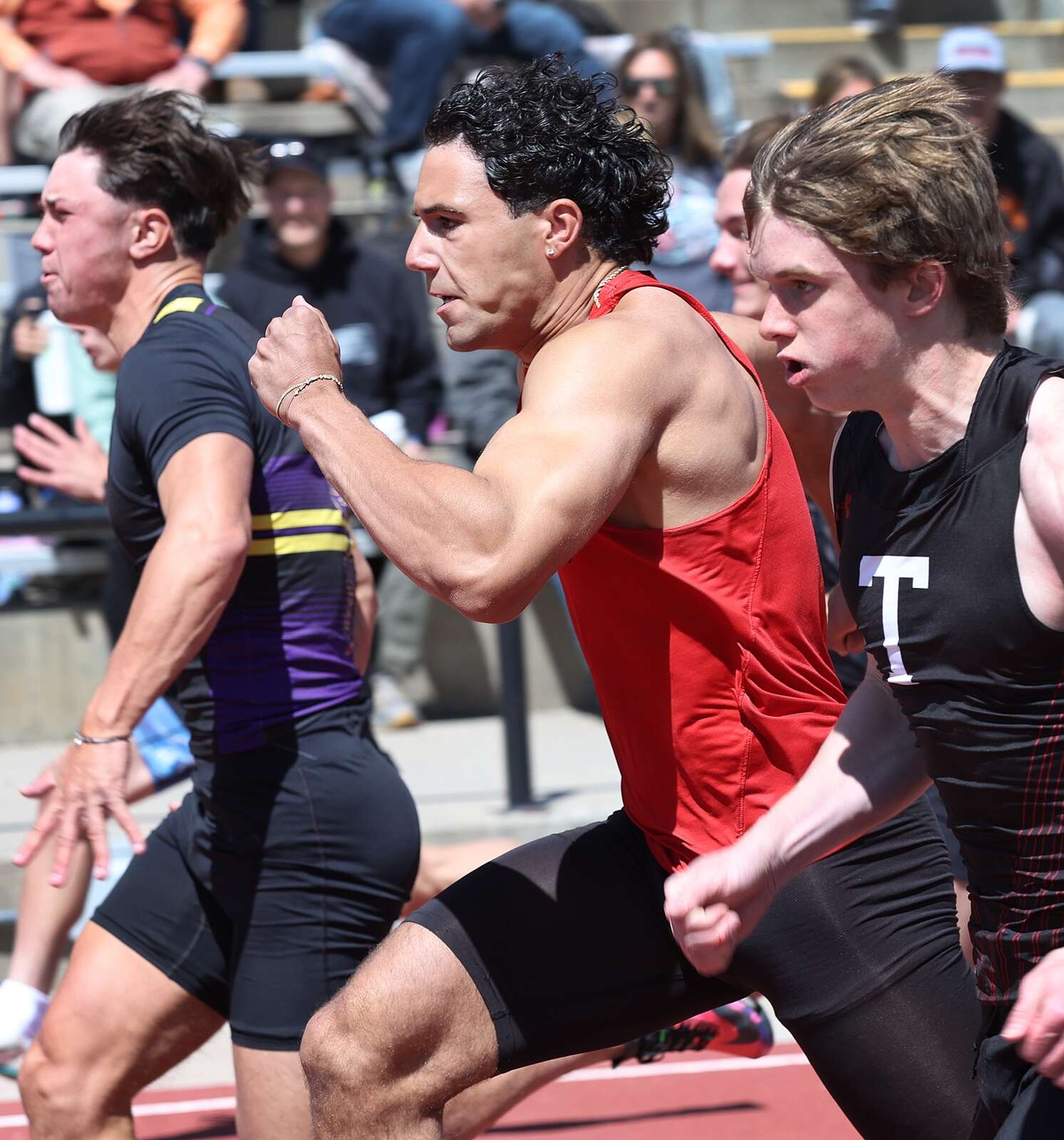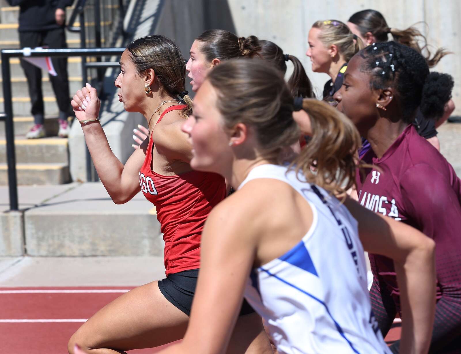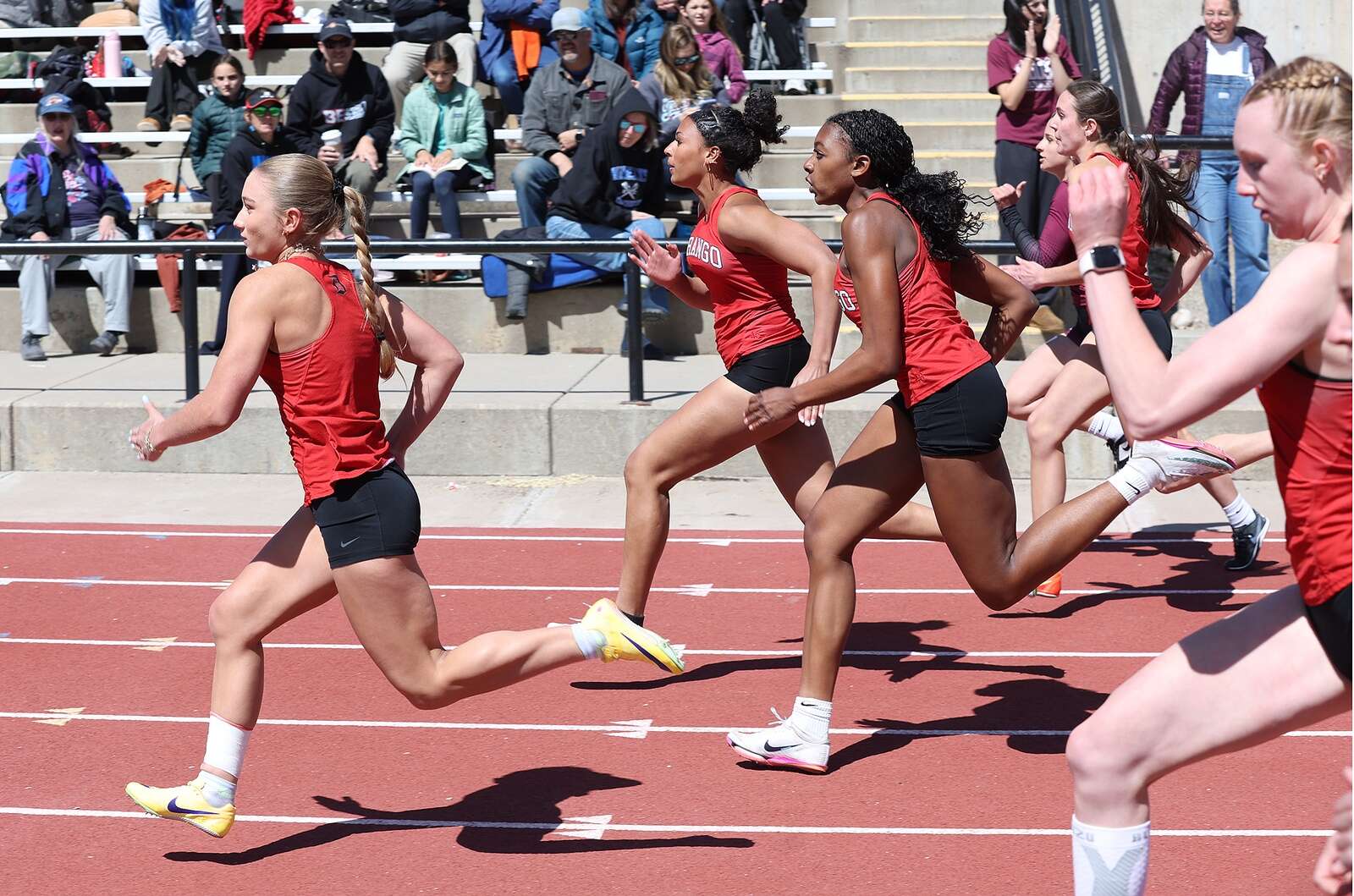 Durango High School runners compete in the 100-meter dash on Saturday during the Ron Keller Invitational track meet at DHS. (Jerry McBride/Durango Herald)
