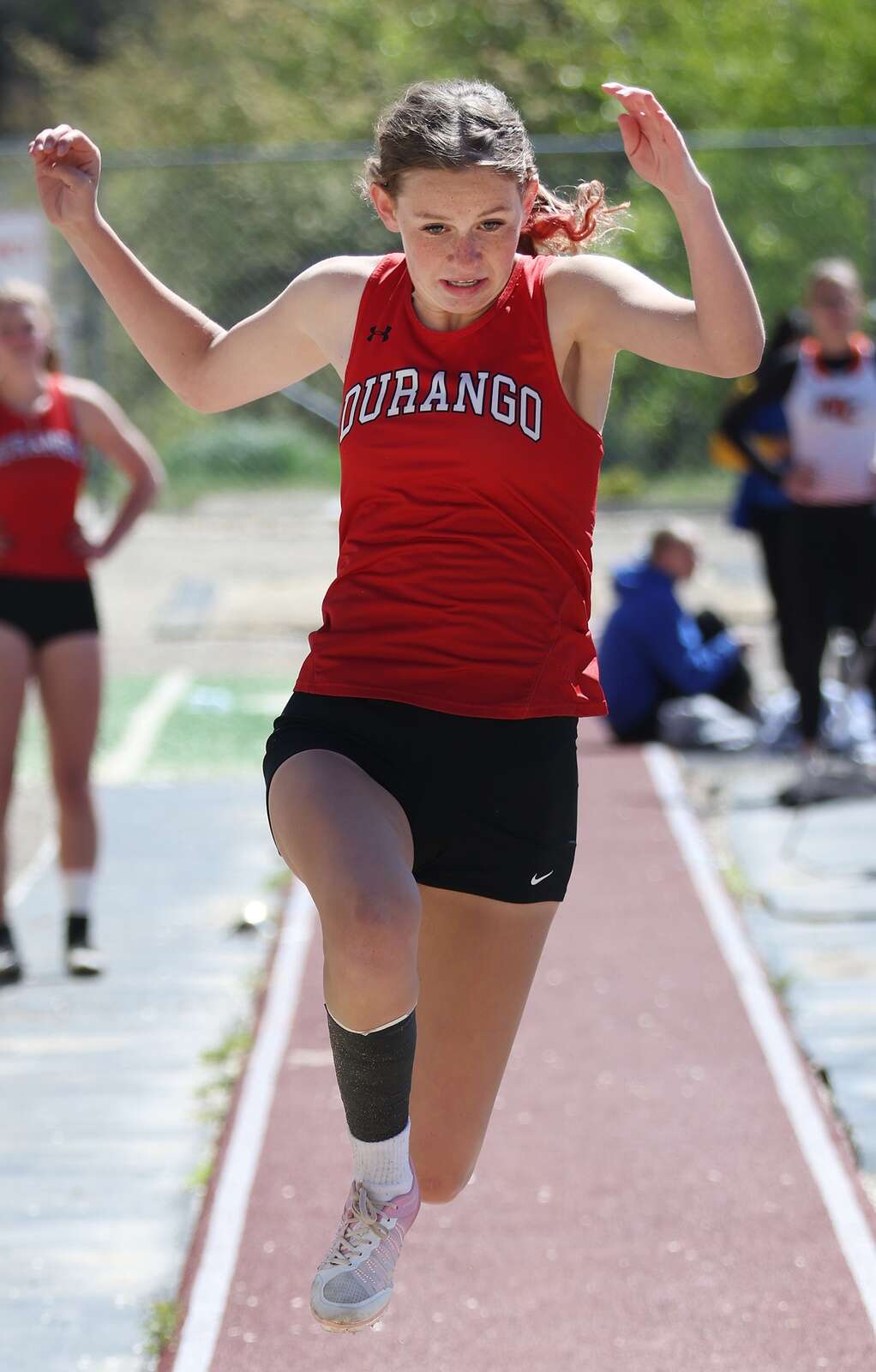 Kylie Williams of Durango High School competes in the long jump on Saturday during the Ron Keller Invitational track meet at DHS. (Jerry McBride/Durango Herald)