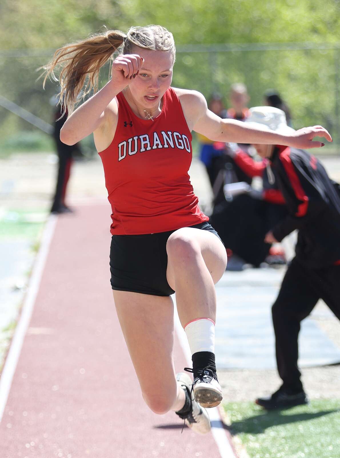 Ashley Bertrand of Durango High School competes in the long jump on Saturday during the Ron Keller Invitational track meet at DHS. (Jerry McBride/Durango Herald)
