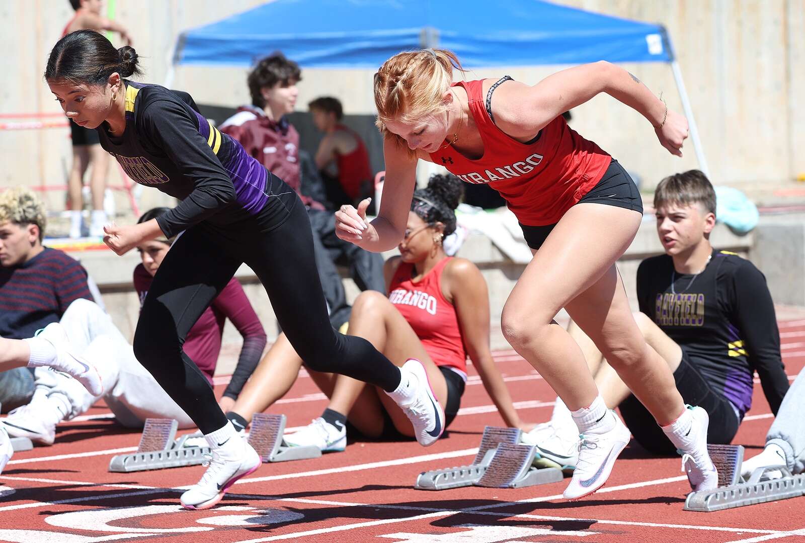 Lilja Johnson, left, of Bayfield High School and Smith Riddell of Durango High School compete in the 100-meter dash on Saturday during the Ron Keller Invitational track meet at DHS. (Jerry McBride/Durango Herald)