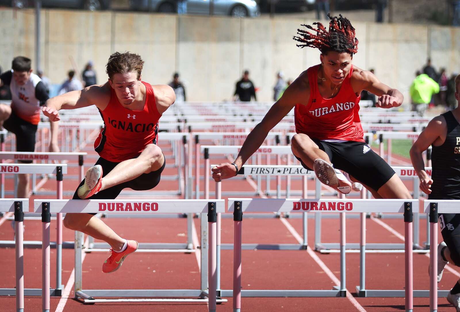 Lincoln deKay, left, of Ignacio High School and Rashad Reece of Durango High School compete in the 110 meter hurdles on Saturday during the Ron Keller Invitational track meet at DHS. (Jerry McBride/Durango Herald)