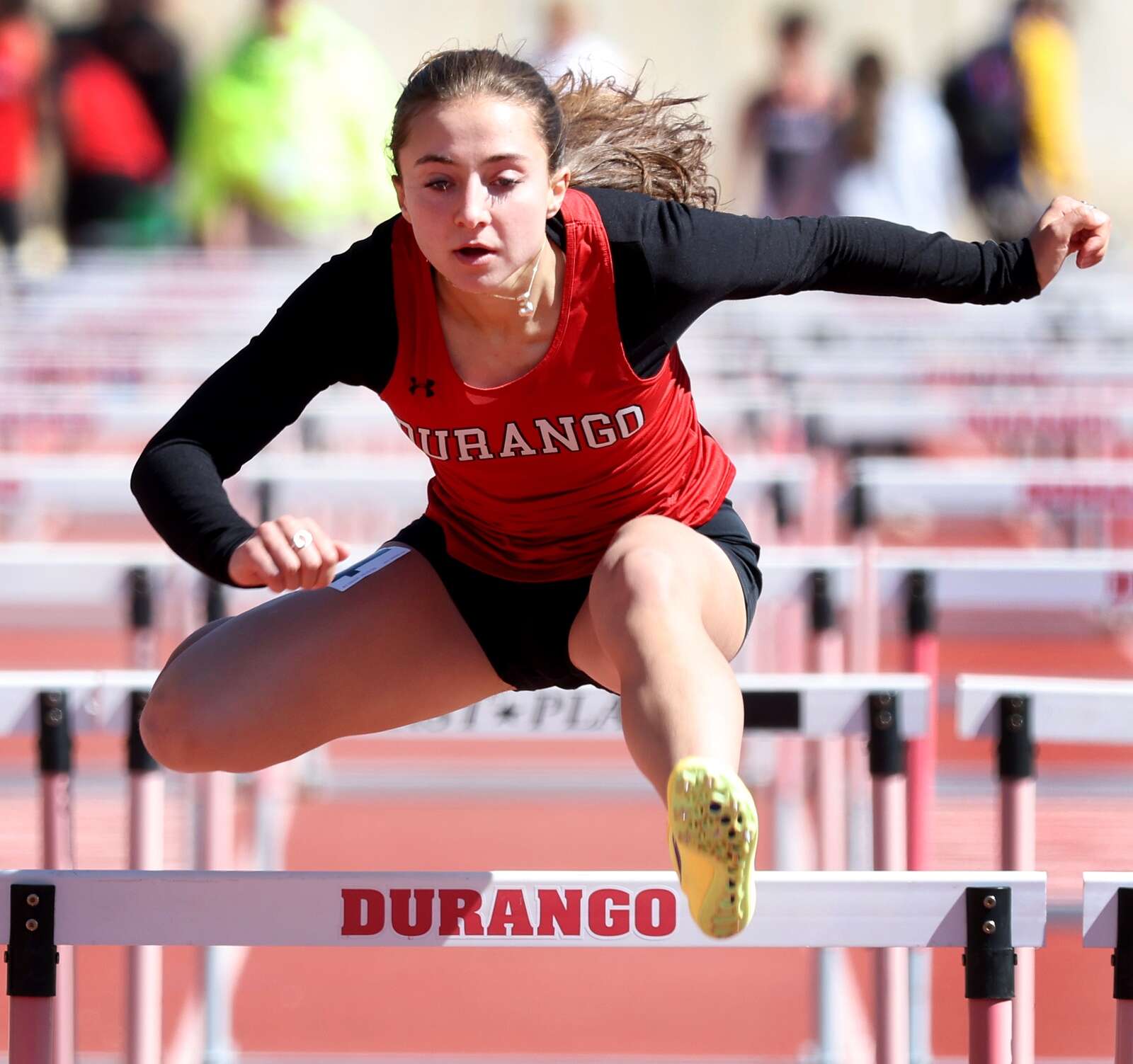 Evie Morris of Durango High School competes in the 100-meter hurdles on Saturday during the Ron Keller Invitational track meet at DHS. (Jerry McBride/Durango Herald)