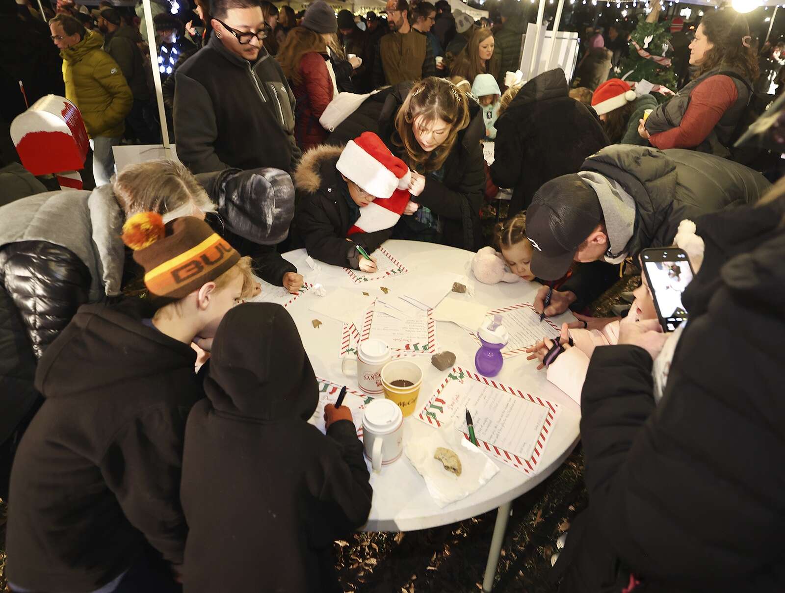 Children and adults gather around a table writing their letters to Santa Claus before placing them in the North Pole mailbox on Friday during the Singing with Santa event in Buckley Park. Hundreds attend the annual event that is put on by the Durango Business Improvement District. (Jerry McBride/Durango Herald)