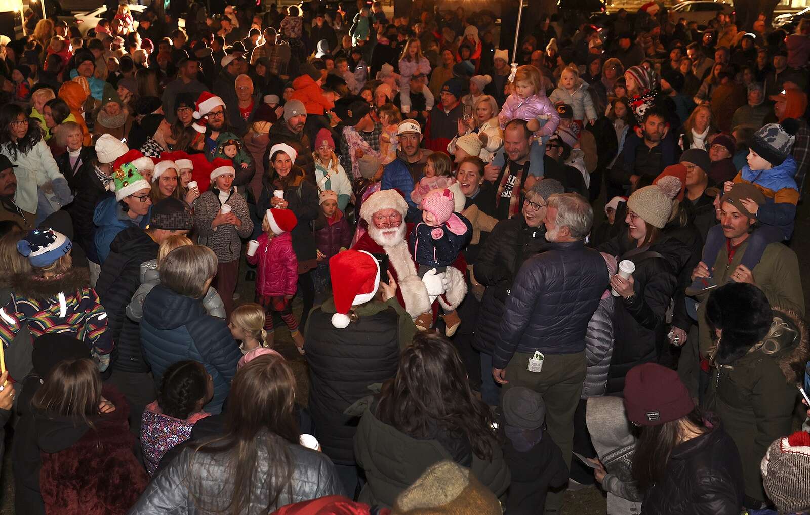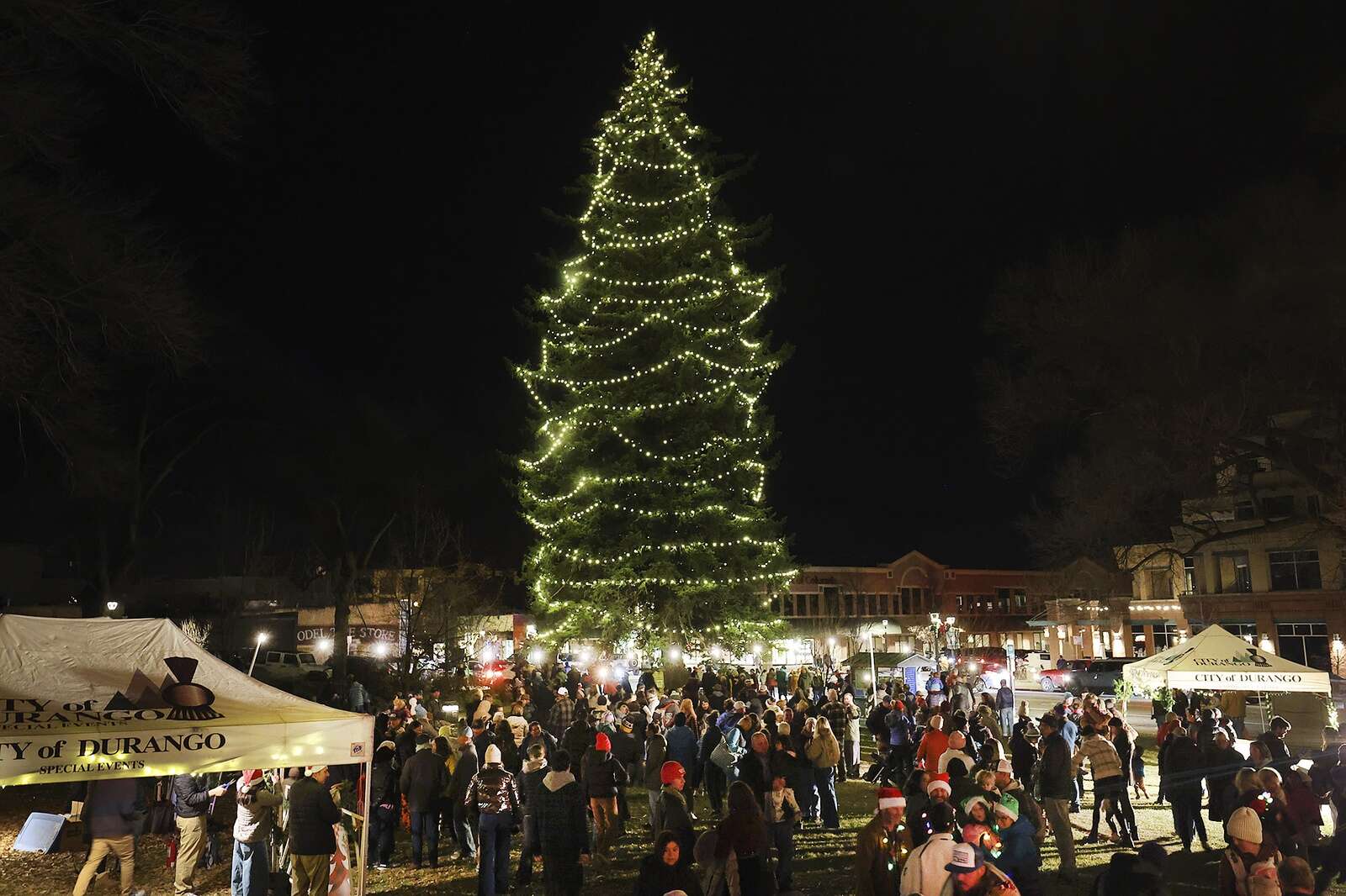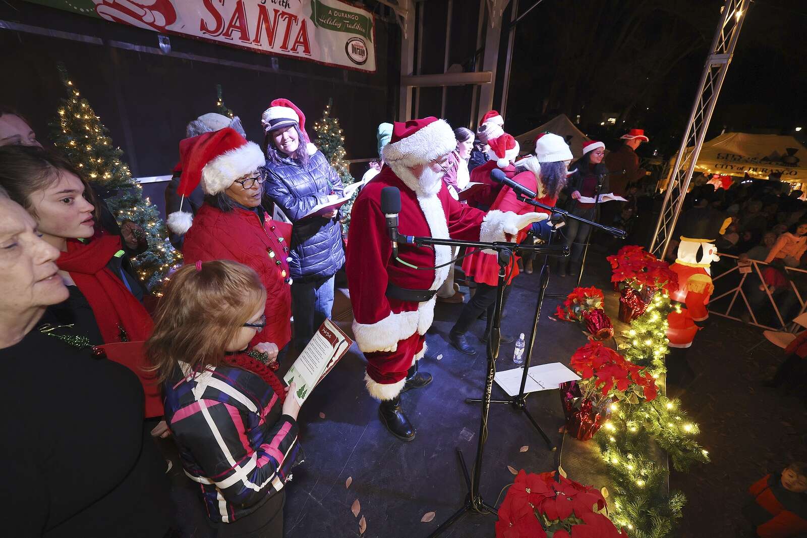 After Santa Claus sang Christmas carols during the Singing with Santa event on Friday, the crowd in Buckley Park counted down from 10 before flipping the switch on the Community Christmas Tree that is covered with 1,750 lights. Hundreds attend the annual event that is put on by the Durango Business Improvement District. (Jerry McBride/Durango Herald)
