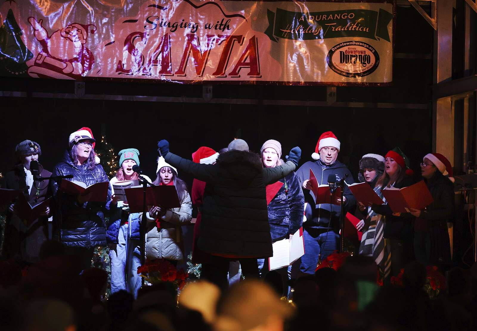 The LB Choir sings Christmas carols Friday as the crowd awaits the arrival of Santa Claus and the lighting of the Community Christmas Tree during the Singing with Santa event in Buckley Park. Hundreds attend the annual event that is put on by the Durango Business Improvement District. (Jerry McBride/Durango Herald)
