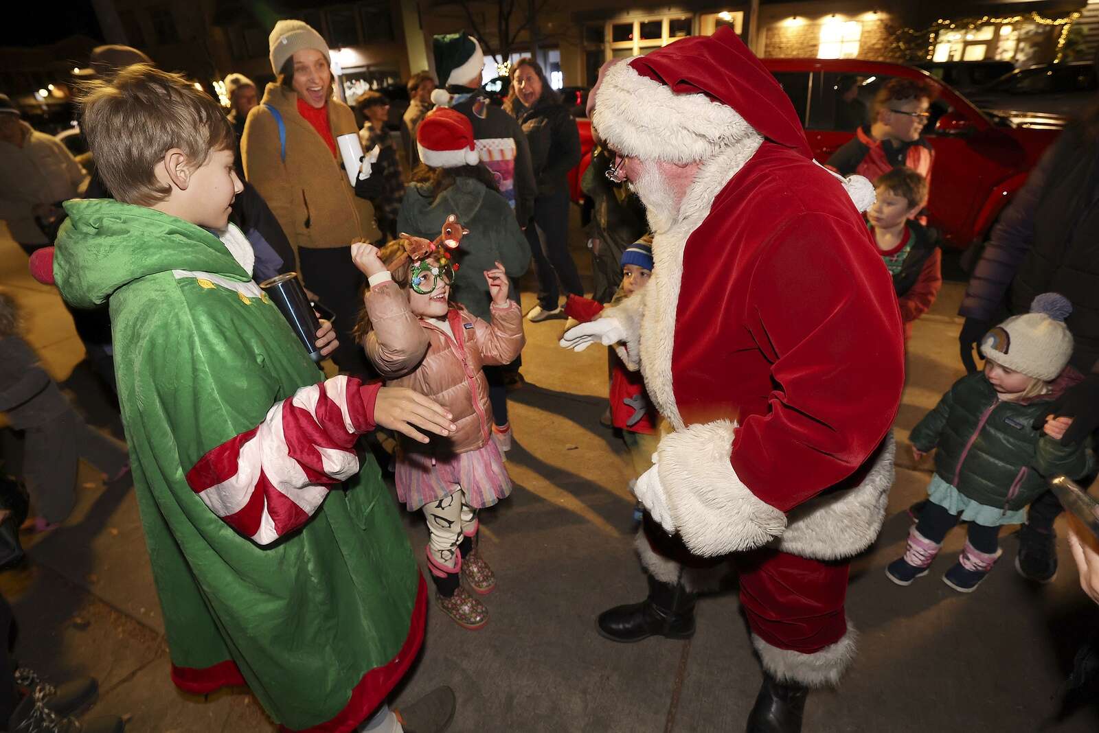 Santa Claus arrives on Friday during the Singing with Santa event in Buckley Park making his way to the stage to sing Christmas carols and light the Community Christmas Tree. Hundreds attend the annual event that is put on by the Durango Business Improvement District. (Jerry McBride/Durango Herald)