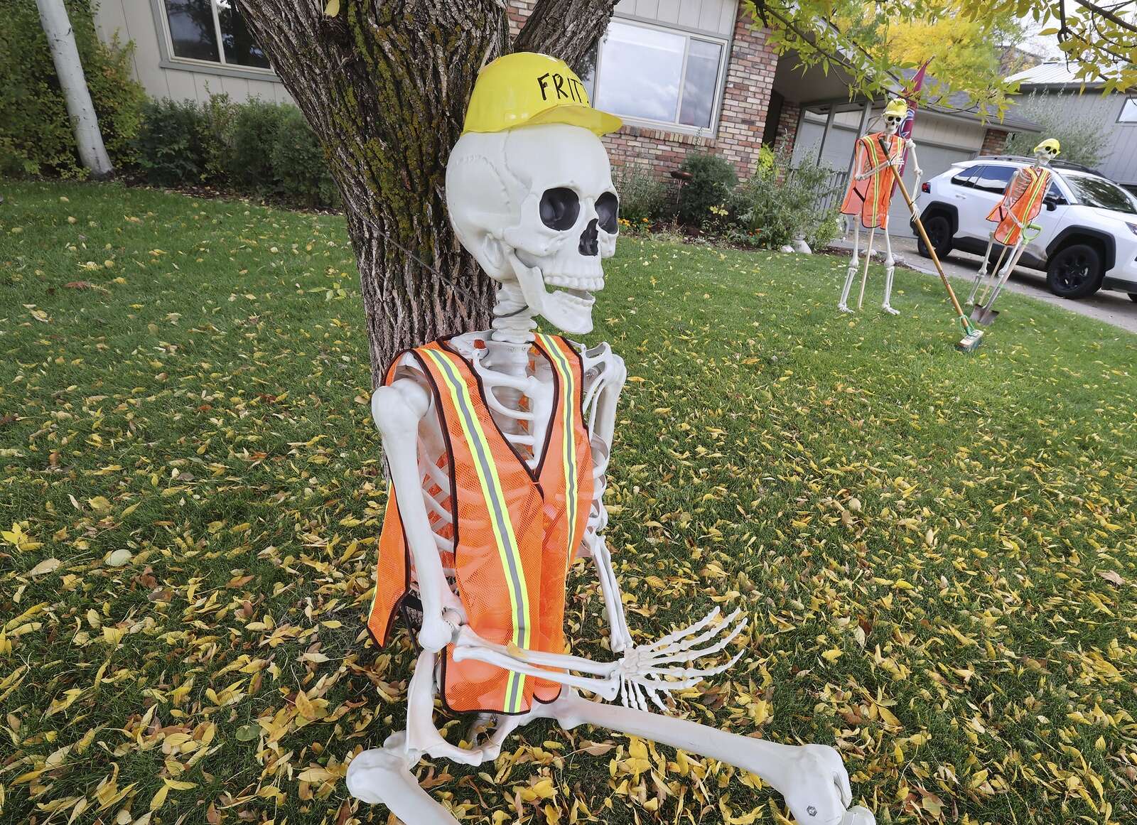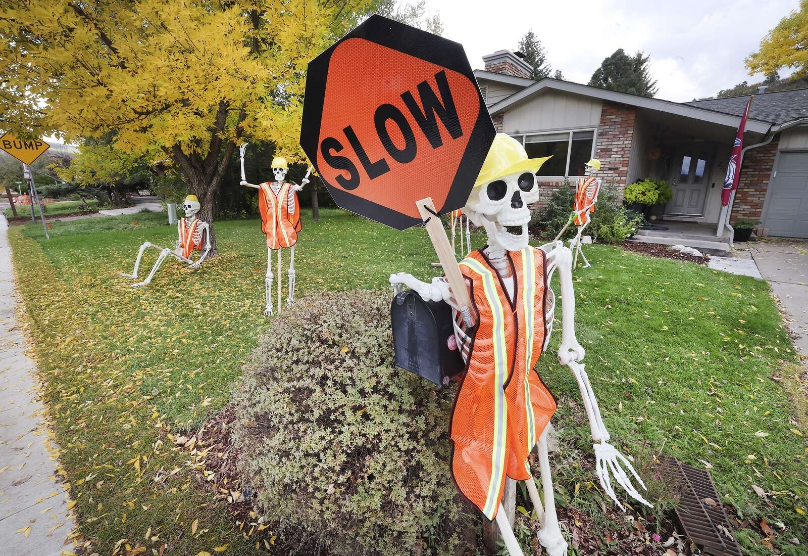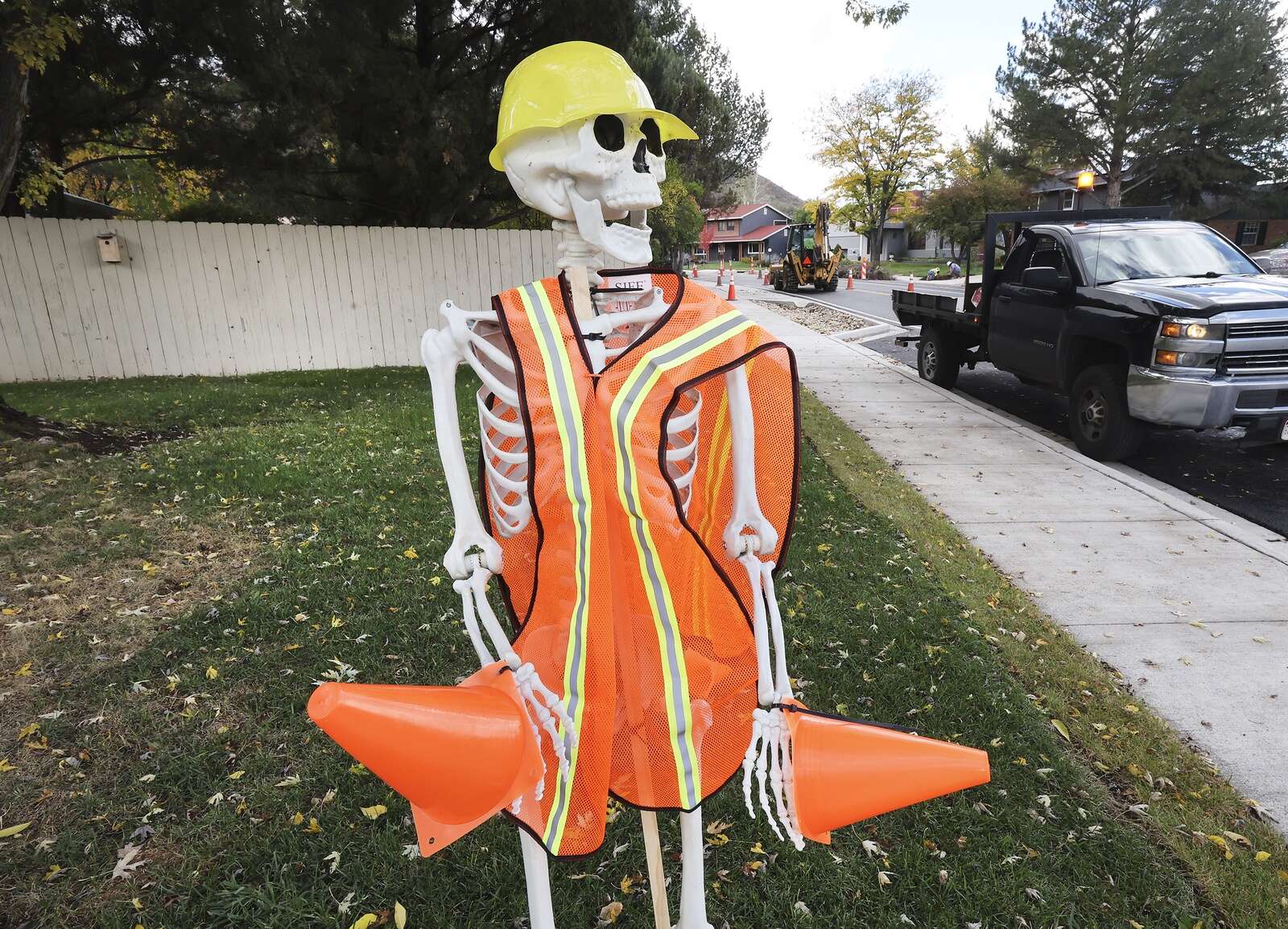 Jessica and Jimmy Micikas have a little fun with Halloween decorations Tuesday in front of their home on North College Drive, which has been under construction for about two years. The construction guys love it, Jessica Micikas said. (Jerry McBride/Durango Herald)