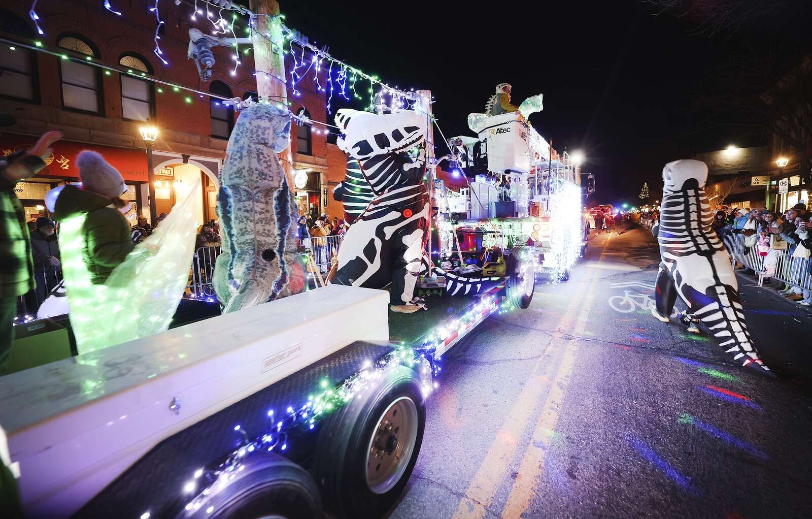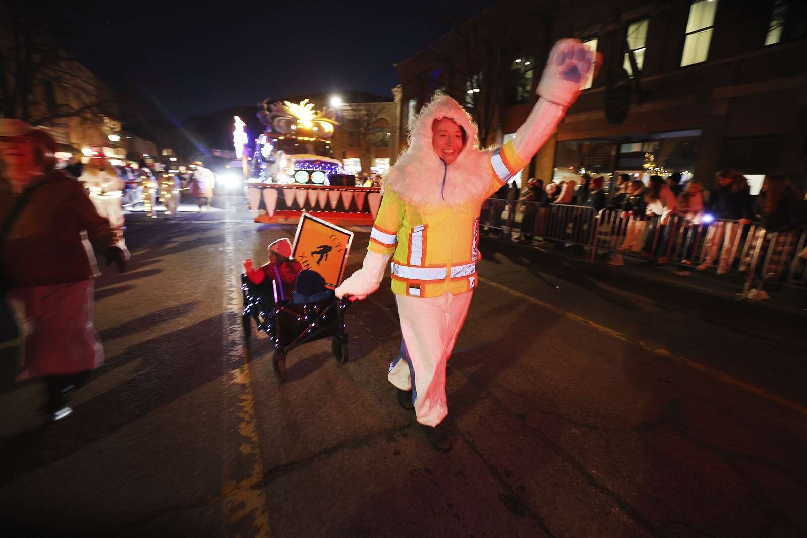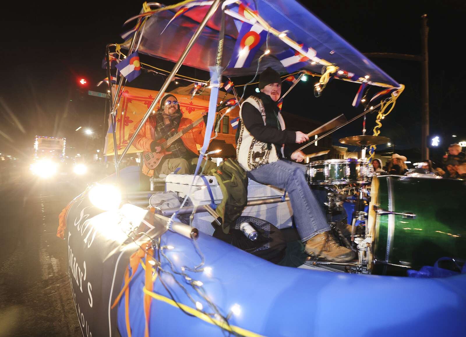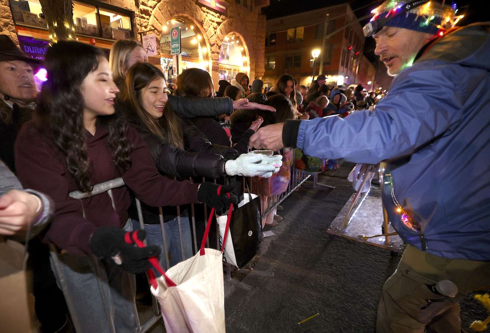 Sidewalks were filled with people in downtown Durango to watch the Snowdown Light Parade 2026 on Friday go up Main Avenue. (Jerry McBride/Durango Herald)
