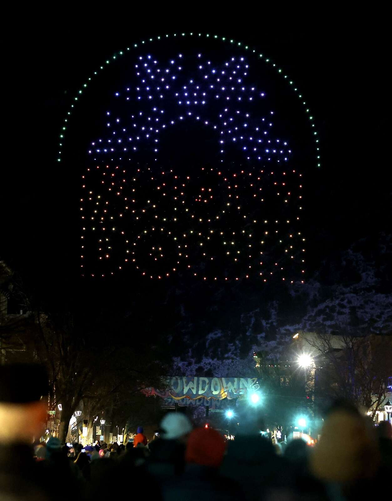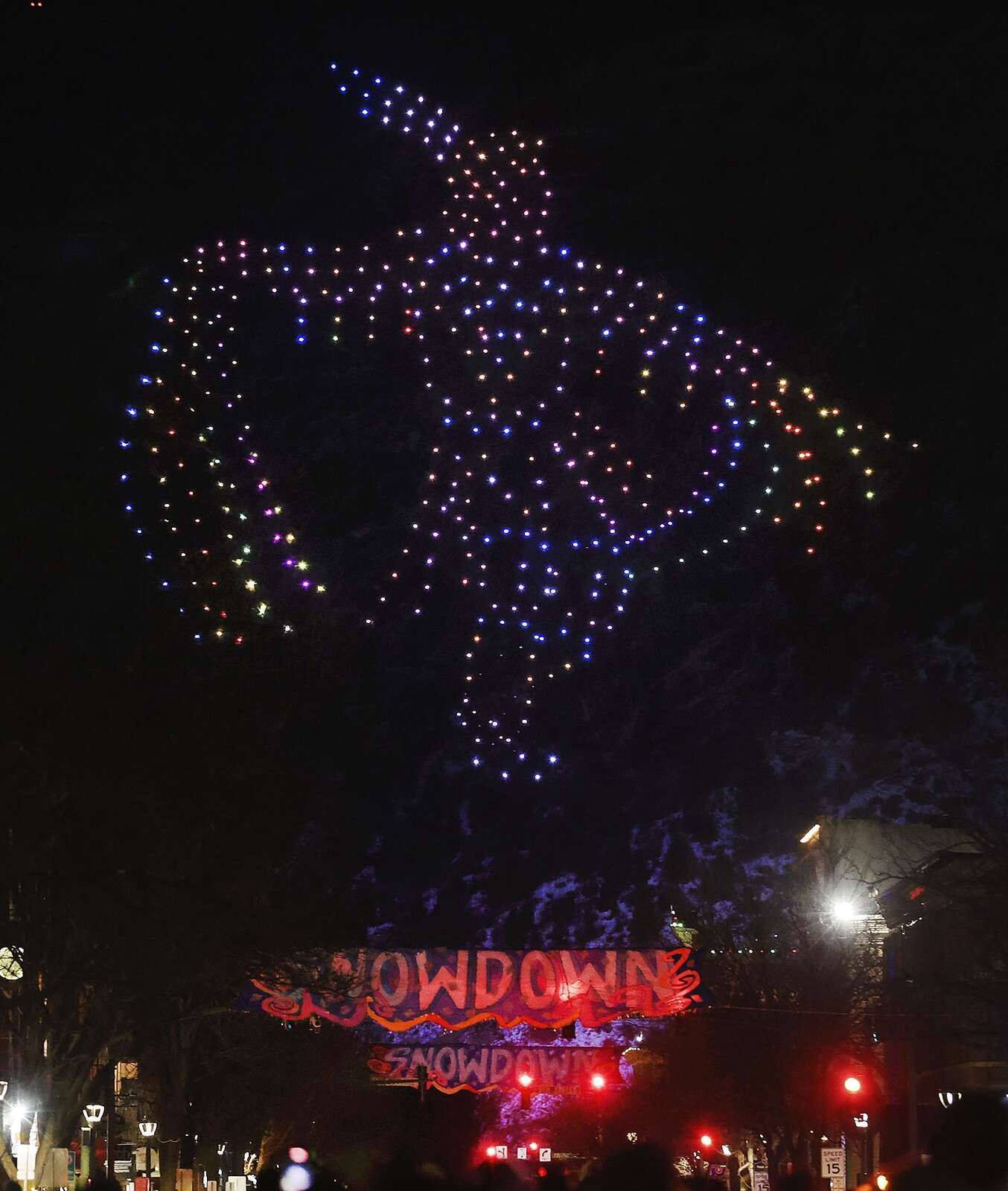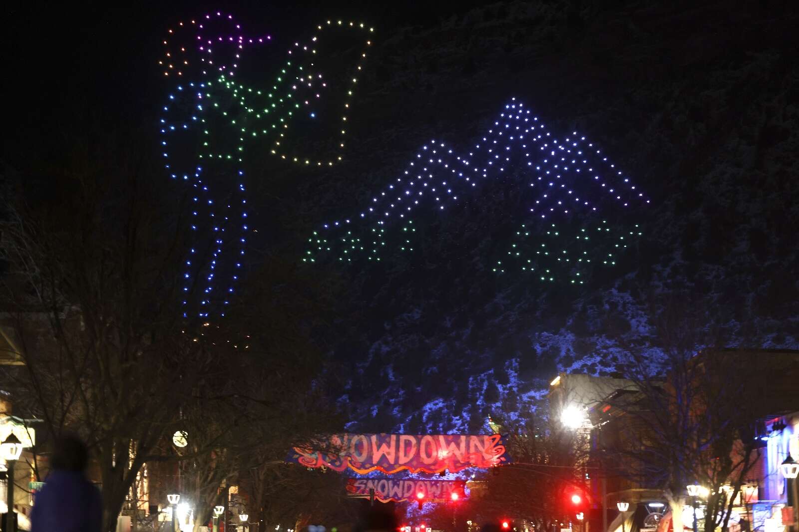 At the end of the Snowdown Light Parade 2026 on Friday a drone show appeared above Main Avenue in downtown Durango. (Jerry McBride/Durango Herald)