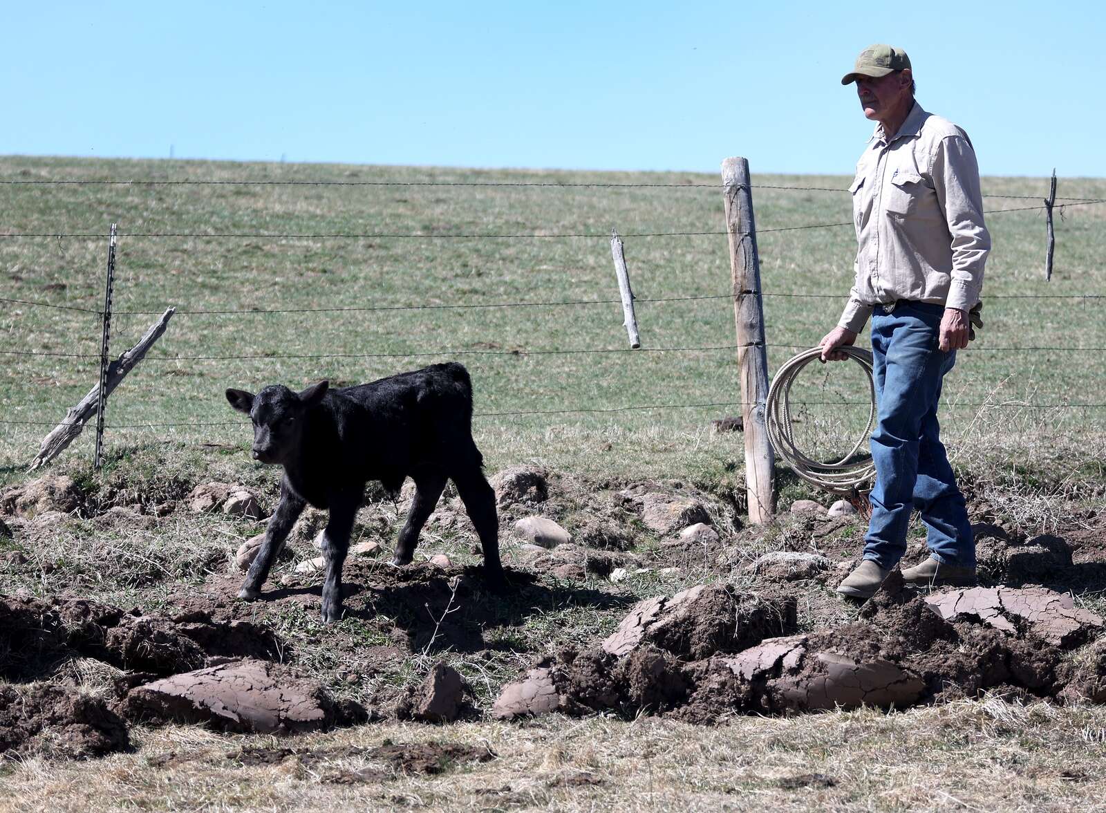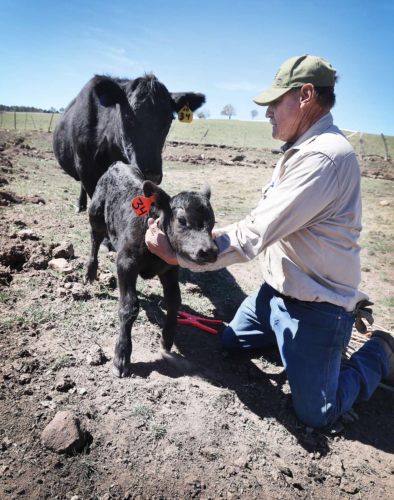 Wayne Semler releases a day-old Angus calf back to its very worried mother on Saturday after placing a tag in its ear. Wayne and his wife Melody, longtime ranchers, have just started calving this year at their ranch south of Bayfield with hopes of 80 newborns by the time it’s all over. (Jerry McBride/Durango Herald)