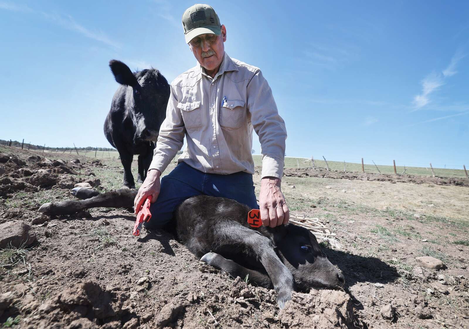 Wayne Semler places a tag in the ear of a day-old Angus calf on Saturday as its mother keeps watch. Wayne and his wife Melody, longtime ranchers, have just started calving this year at their ranch south of Bayfield with hopes of 80 newborns by the time it’s all over. (Jerry McBride/Durango Herald)