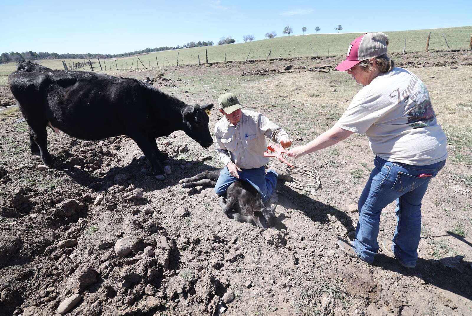 Melody Semler assists her husband Wayne Semler as he places a tag in the ear of a day-old Angus calf on Saturday as its mother keeps an eye on its calf. The longtime ranchers have just started calving this year at their ranch south of Bayfield with hopes of 80 newborns by the time it’s all over. (Jerry McBride/Durango Herald)