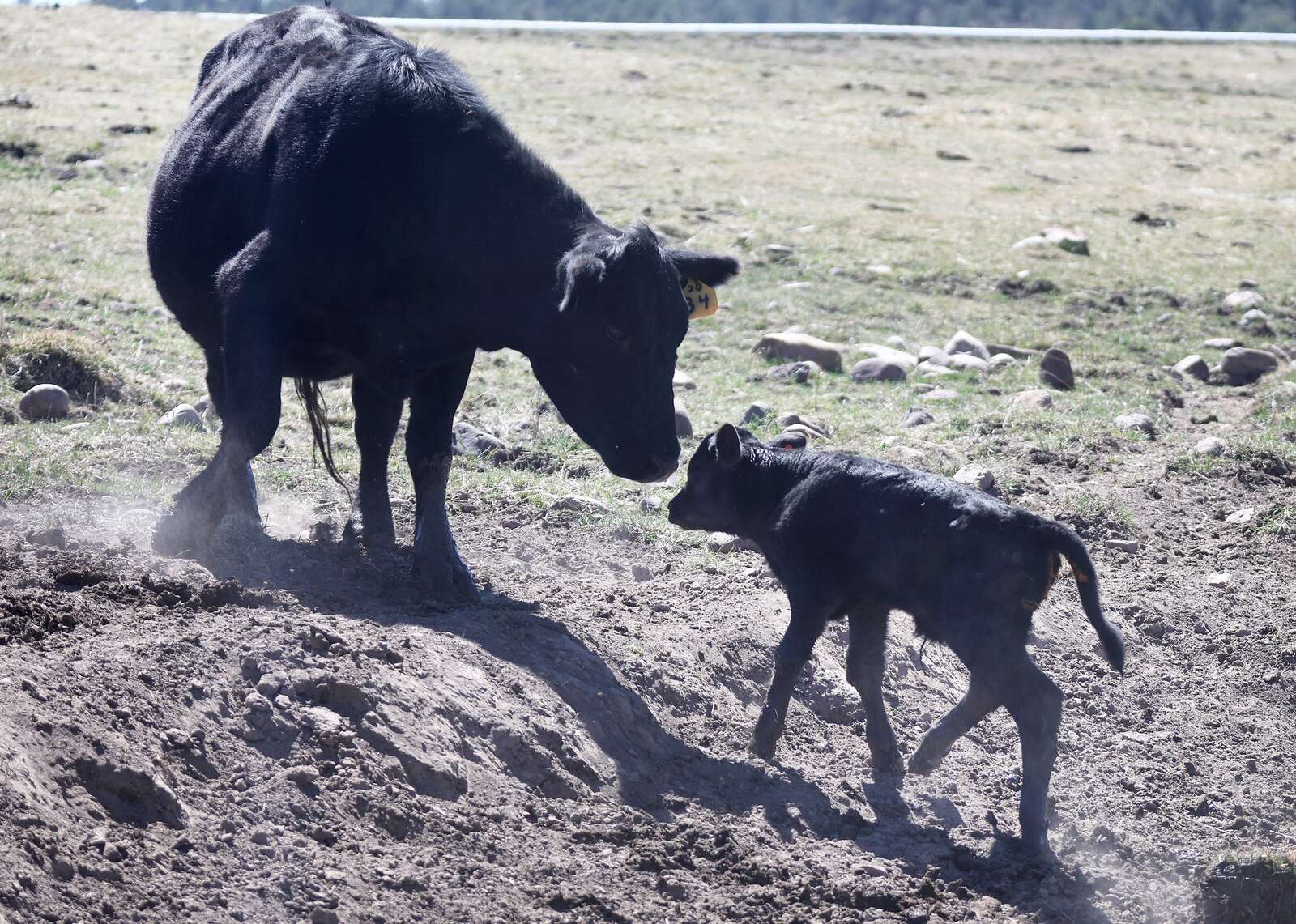 A day-old Angus calf walks up to its mother on Saturday at Wayne and Melody Semler’s ranch south of Bayfield. The couple have just started calving this year at their ranch with hopes of 80 newborns by the time it’s all over. (Jerry McBride/Durango Herald)