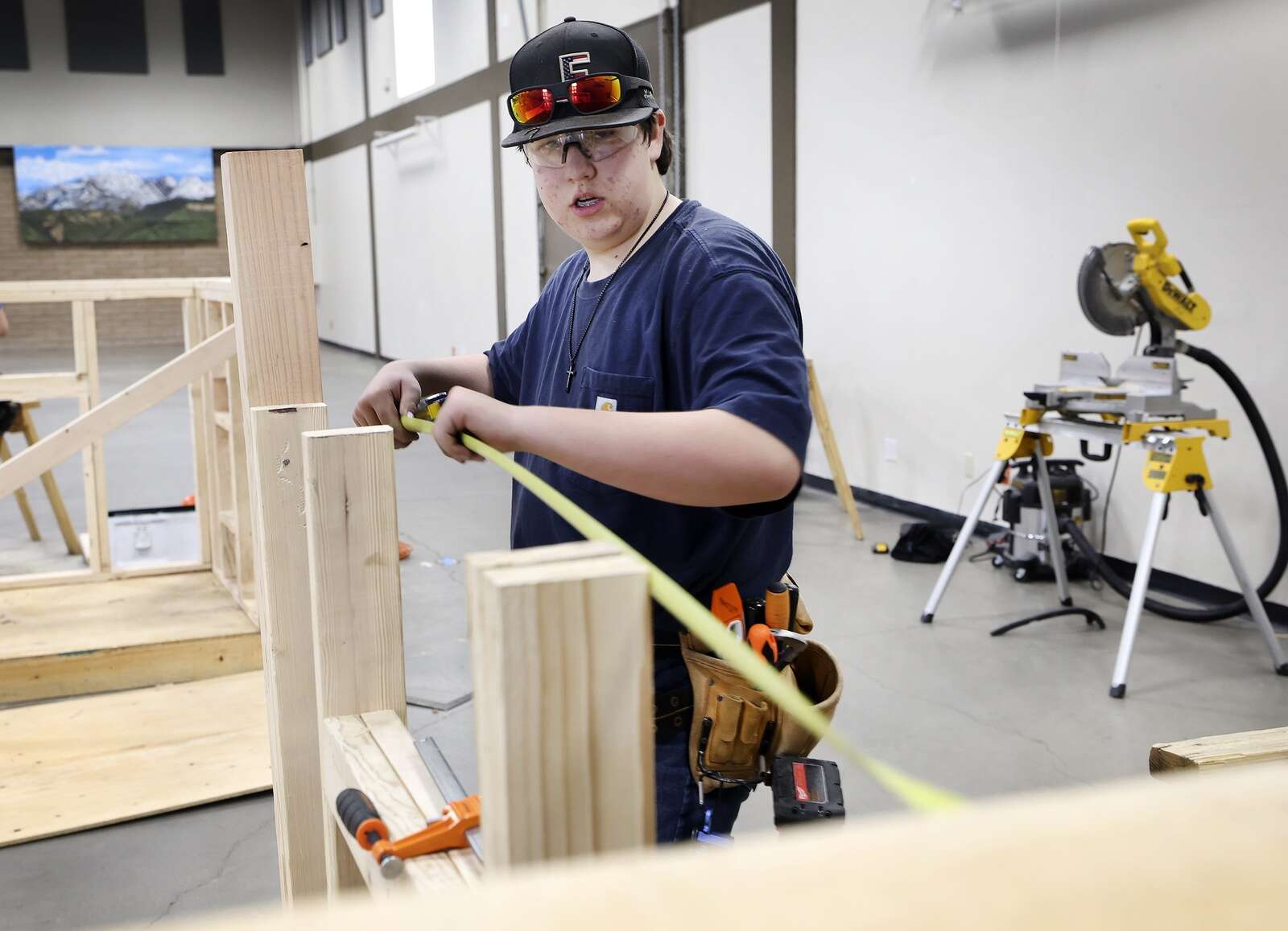 Kylynd Parrish 18, of Bayfield High School, competes in the Region 8 SkillsUSA Competition – Carpentry Division on Friday building a shed in the Exhibit Building at the La Plata County Fairgrounds. Students from area high schools participated in building cabinets, framing a shed and welding. The top two winners of each category will move on to state and national competitions. (Jerry McBride/Durango Herald)