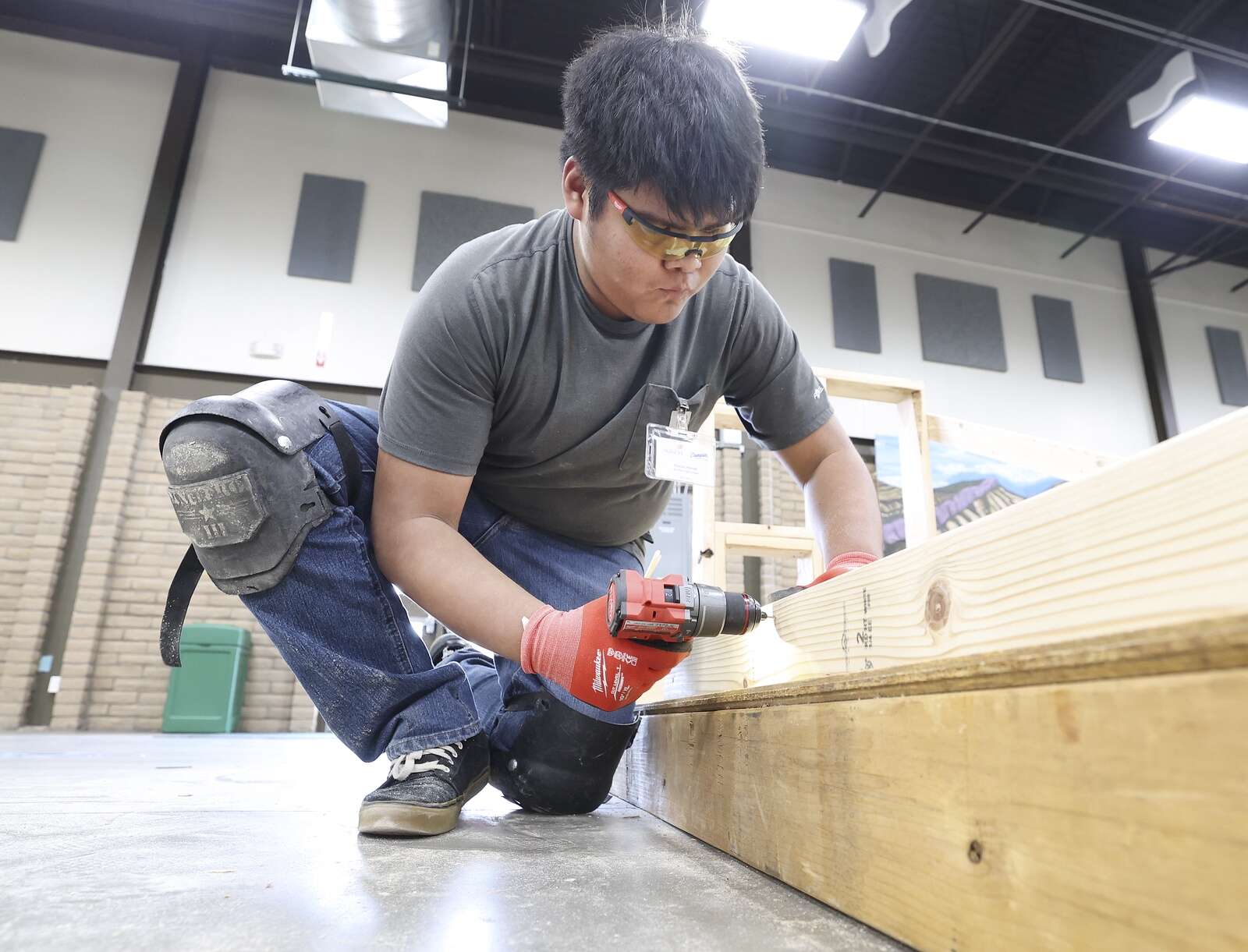 AJ Putnam, 15, a sophomore at Durango High School, competes in the Region 8 SkillsUSA Competition – Carpentry Division on Friday building a shed in the Exhibit Building at the La Plata County Fairgrounds. Students from area high schools participated in building cabinets, framing a shed and welding. The top two winners of each category will move on to state and national competitions. (Jerry McBride/Durango Herald)