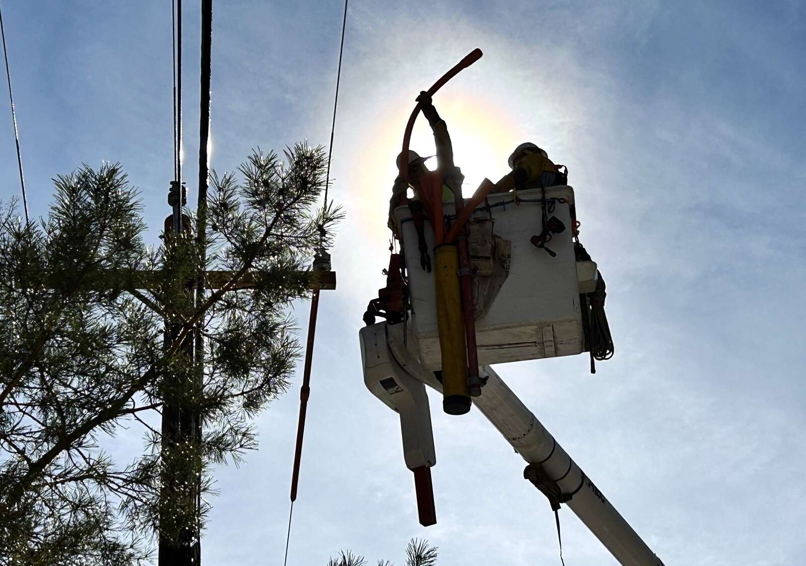 La Plata Electric Association line crews change out a pole Tuesday along County Road 203. (Shane Benjamin/Durango Herald)