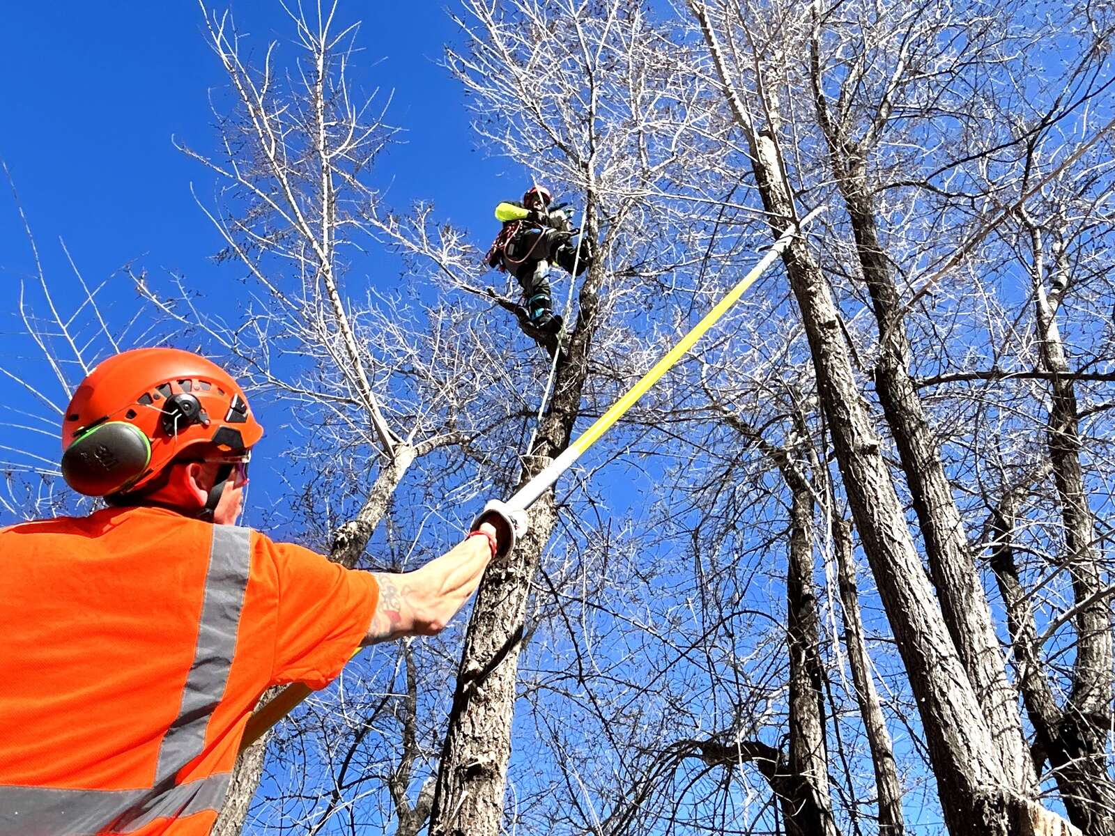 Christian Hodges, holding the pole, and Ryan Lashbrooke, in the tree, trim trees Tuesday along County Road 203. Hodges and Lashbrooke work for Woodchuck Tree Service and are doing contract work for La Plata Electric Association. (Shane Benjamin/Durango Herald)