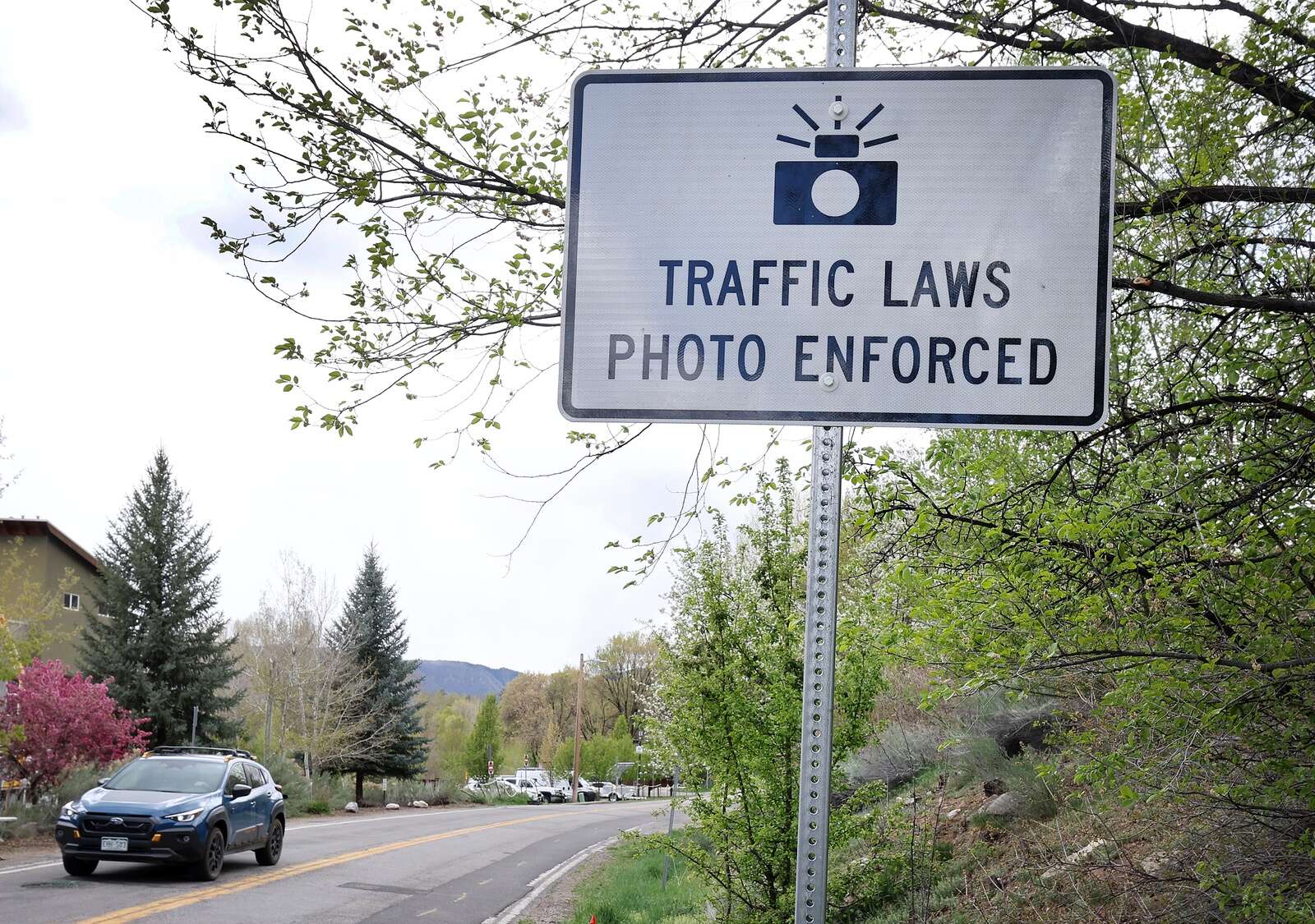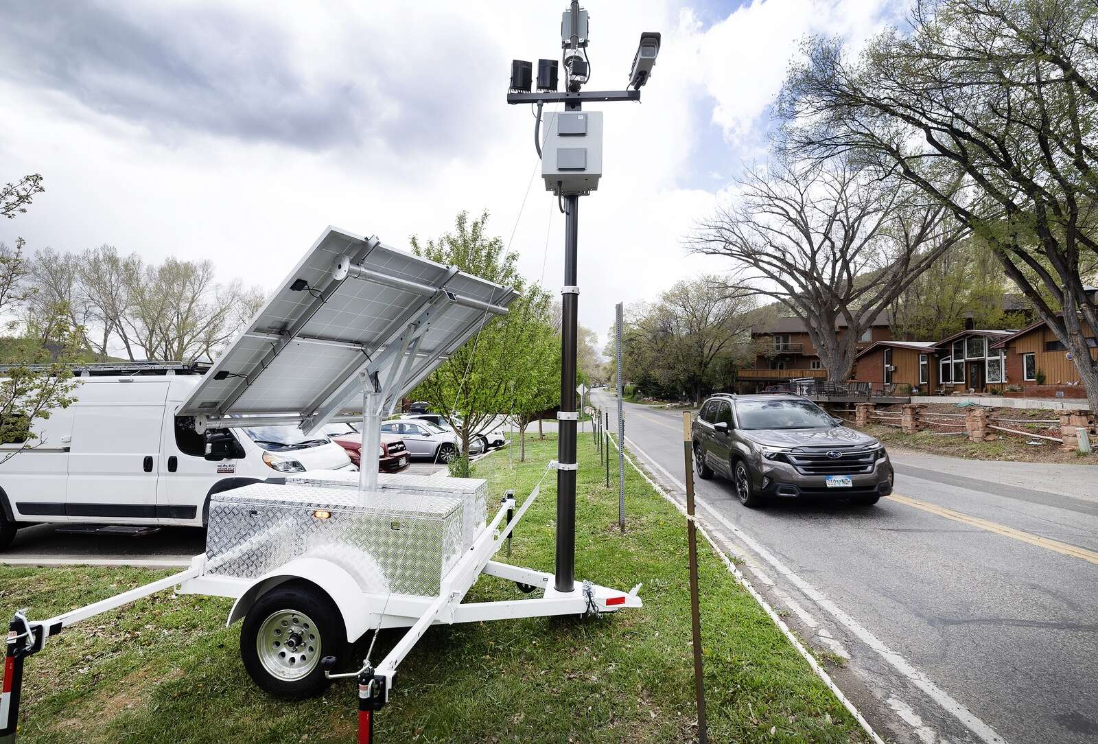 An automated speed enforcement camera takes photos of speeding vehicles Tuesday on Animas View Drive. Speeding drivers will be sent warning tickets before the next phase begins in May, when registered vehicle owners will be sent tickets once photographic evidence is reviewed and verified by the Durango Police Department. (Jerry McBride/Durango Herald)