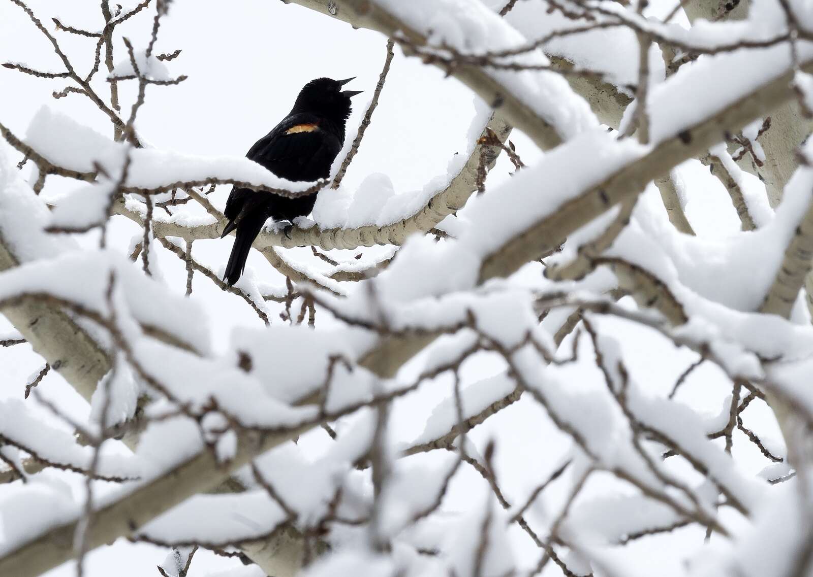 A red-winged blackbird sings out from a snow-covered aspen tree Tuesday at Purgatory Resort after several inches of snow fell in the area. Rain fell at the lower elevations in Durango and throughout La Plata County. (Jerry McBride/Durango Herald)