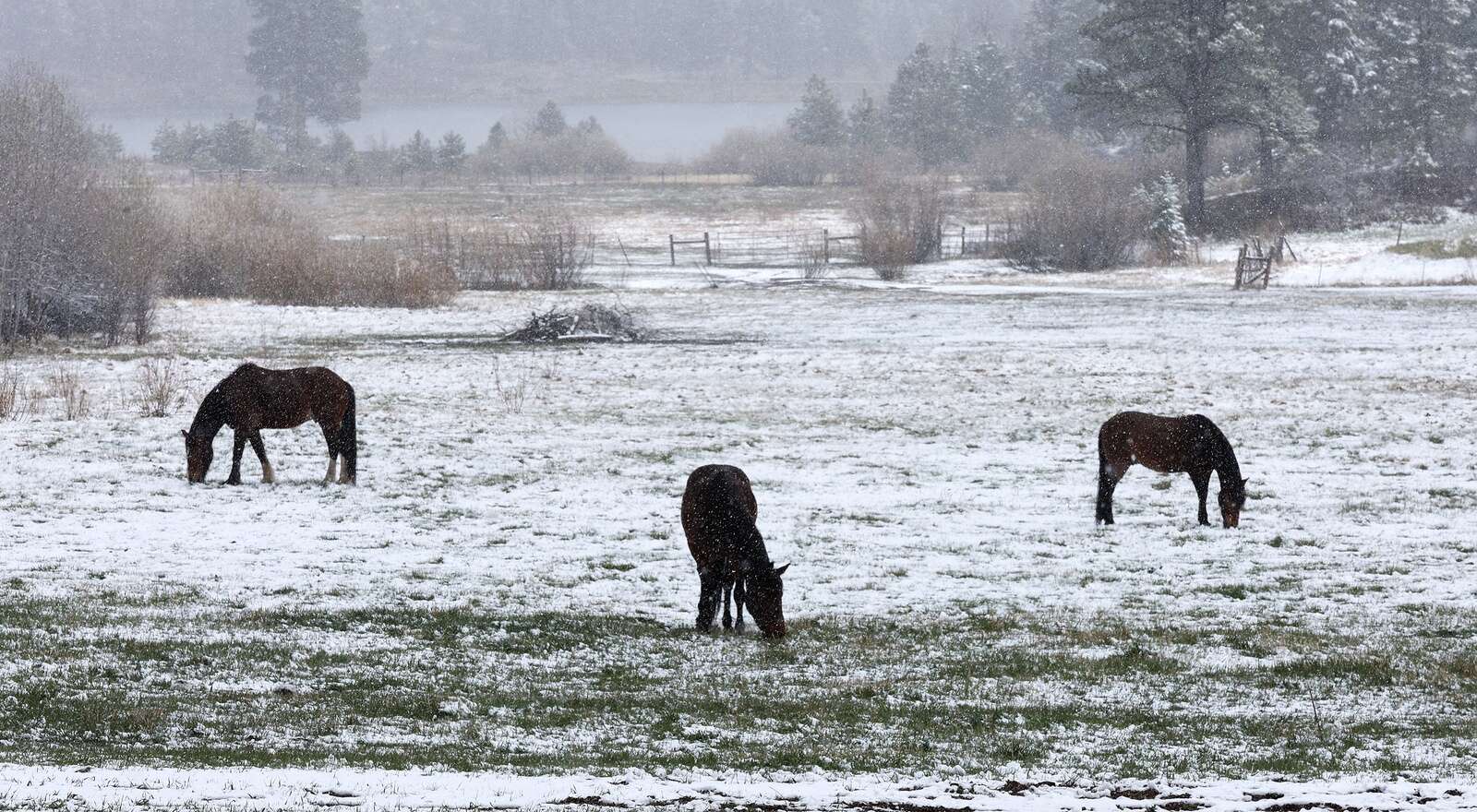 Horses graze through the snow at Bears Ranch on Tuesday after and inch or so fell in the area. (Jerry McBride/Durango Herald)