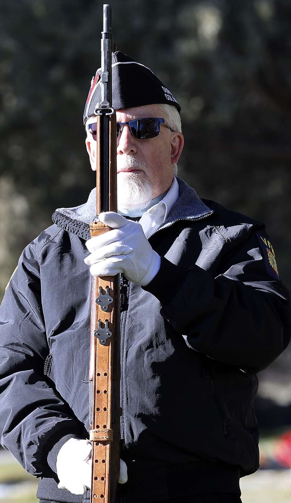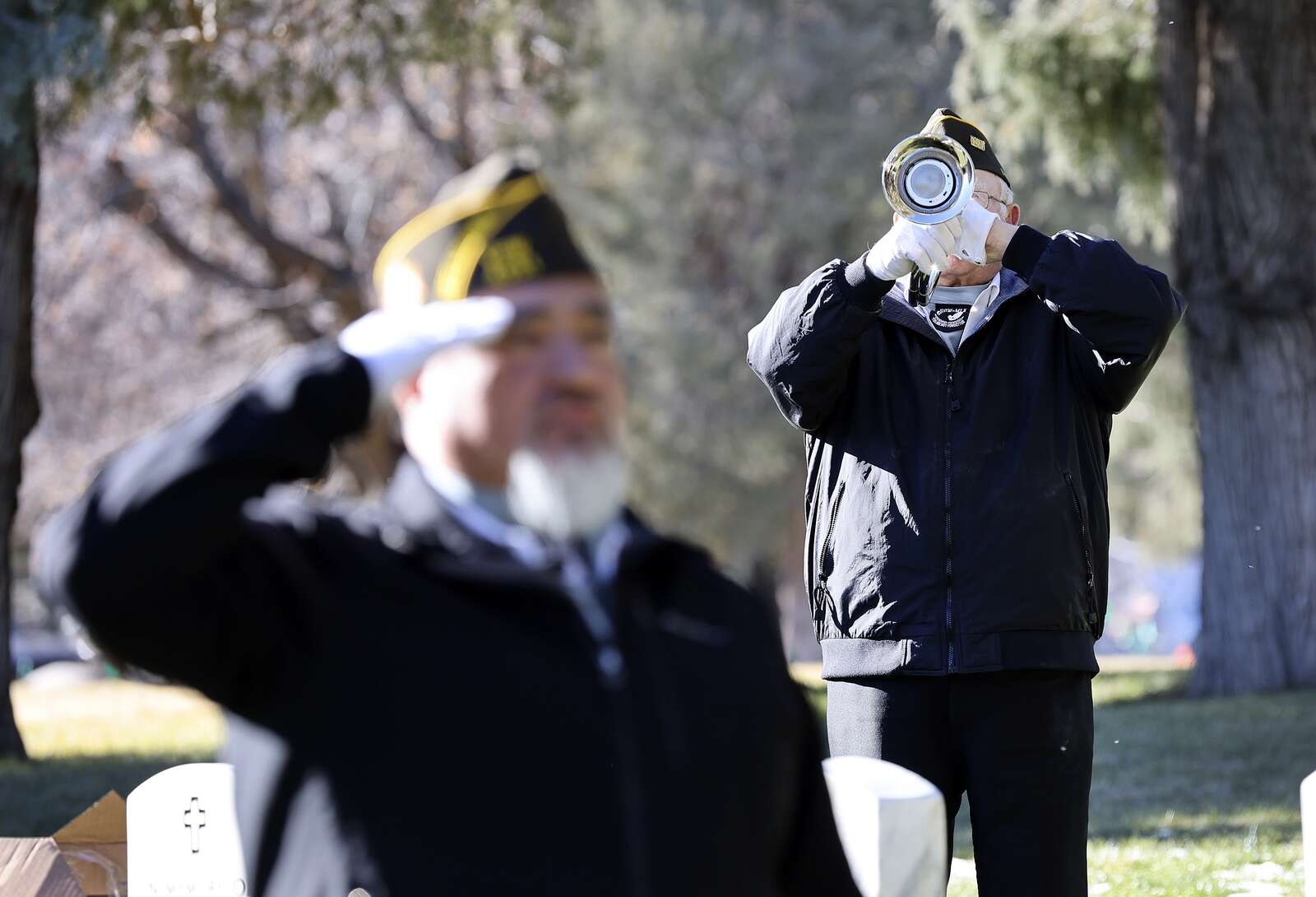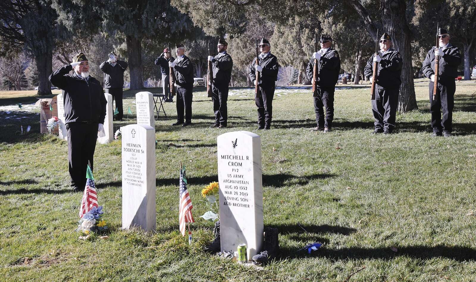 The honor guard is seen as “Taps” is played during the Wreaths Across America event Saturday at Greenmount Cemetery, which is organized by Blue Star Moms of Durango. Volunteers scattered across the cemetery placing 1,230 remembrance wreaths on the graves of fallen heroes. (Jerry McBride/Durango Herald)