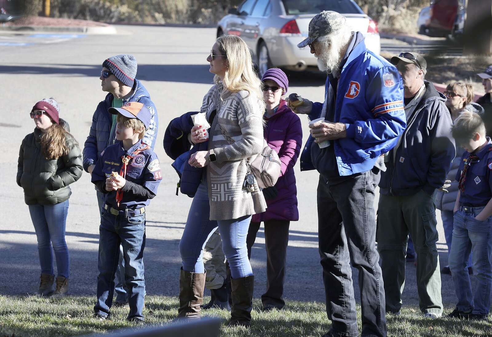 The honor guard is seen as “Taps” is played during the Wreaths Across America event Saturday at Greenmount Cemetery. The event is organized by Blue Star Moms of Durango. Volunteers scattered across the cemetery placing 1,230 remembrance wreaths on the graves of fallen heroes. (Jerry McBride/Durango Herald)