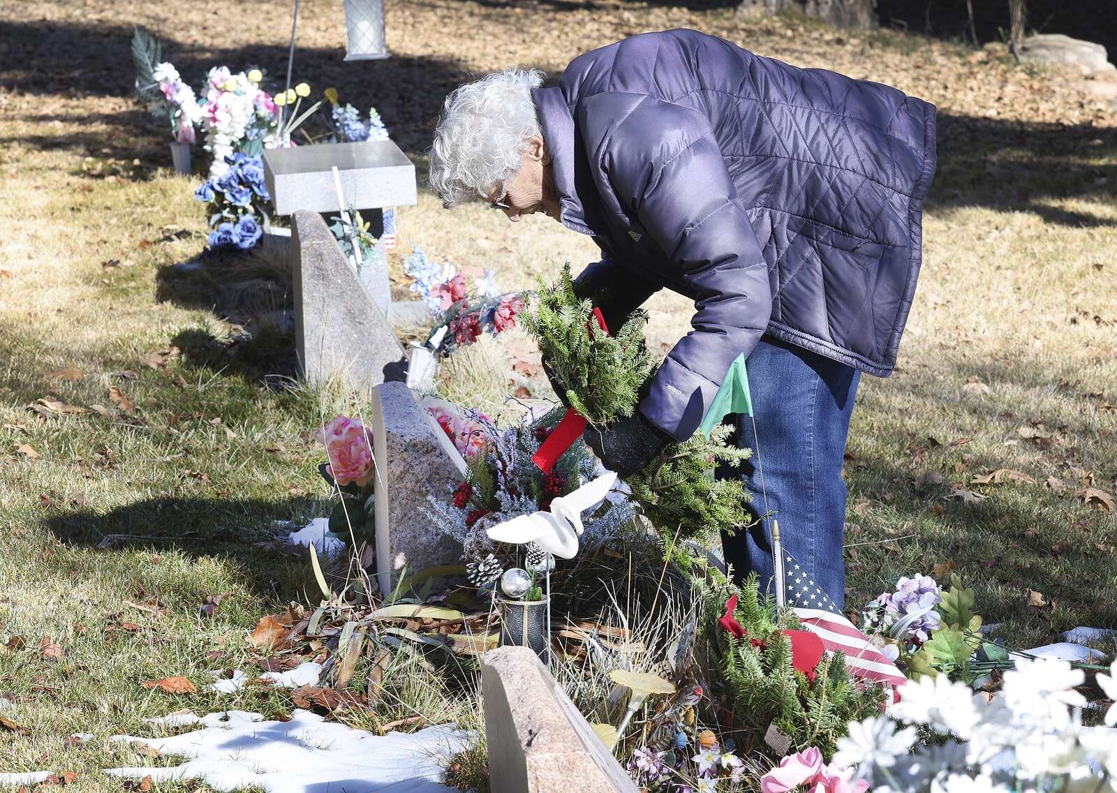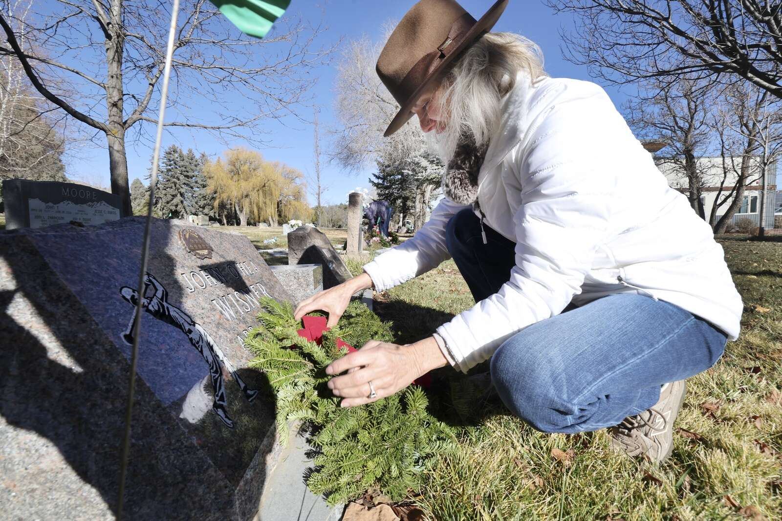 Jolleen Myers places a wreath on her husband, Louis Myers’, headstone at Greenmount Cemetery during the Wreaths Across America event Saturday. The event is organized by Blue Star Moms of Durango. Louis Myers served in the U.S. Navy. Volunteers scattered across the cemetery placing 1,230 remembrance wreaths on the graves of fallen heroes. (Jerry McBride/Durango Herald)