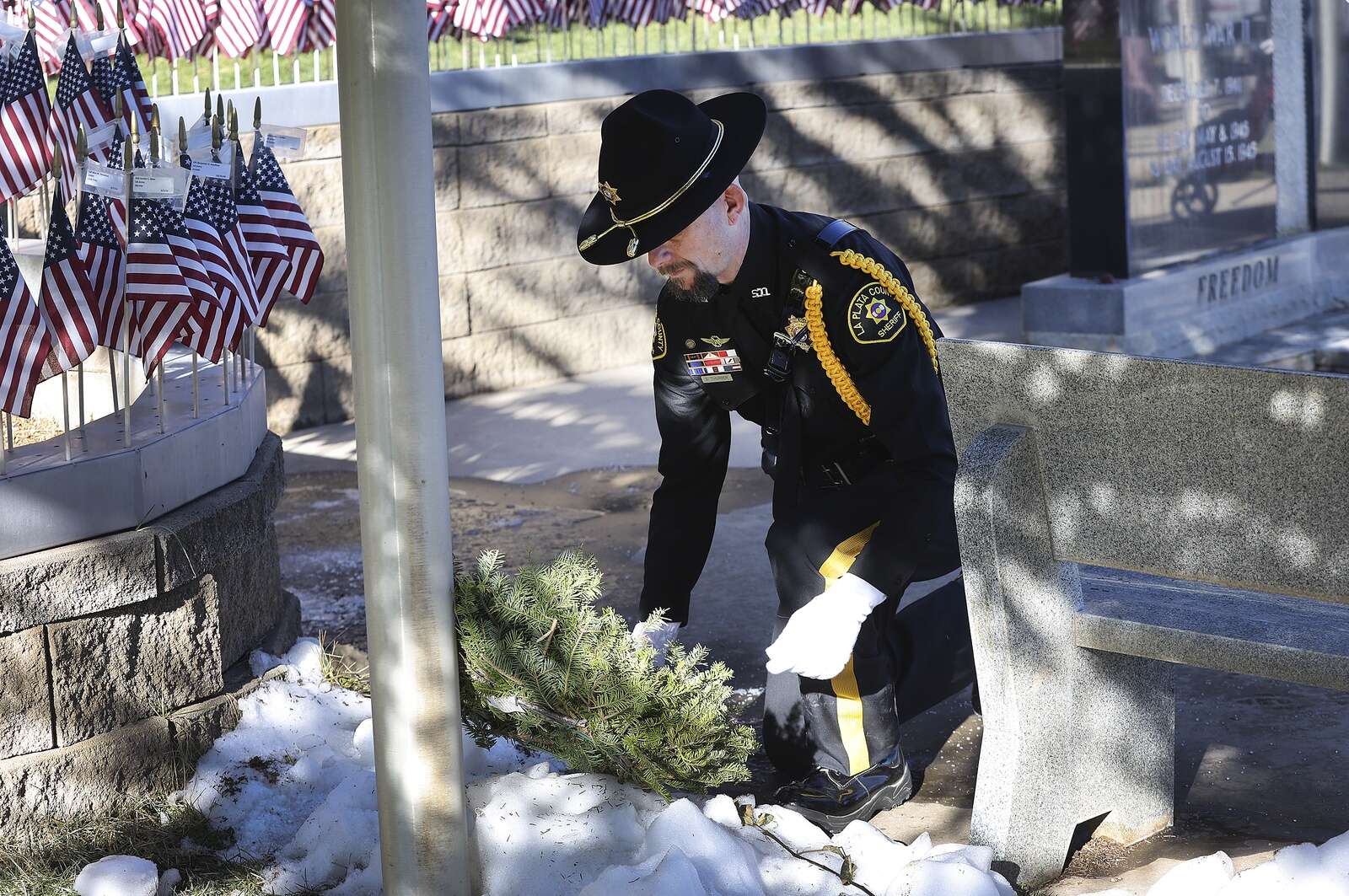 Brayton Thurber, a La Plata County Sheriff’s Office deputy, places a wreath at the Veterans Memorial at Greenmount Cemetery during the Wreaths Across America event Saturday. The event is organized by Blue Star Moms of Durango. Volunteers scattered across the cemetery placing 1,230 remembrance wreaths on the graves of fallen heroes. (Jerry McBride/Durango Herald)