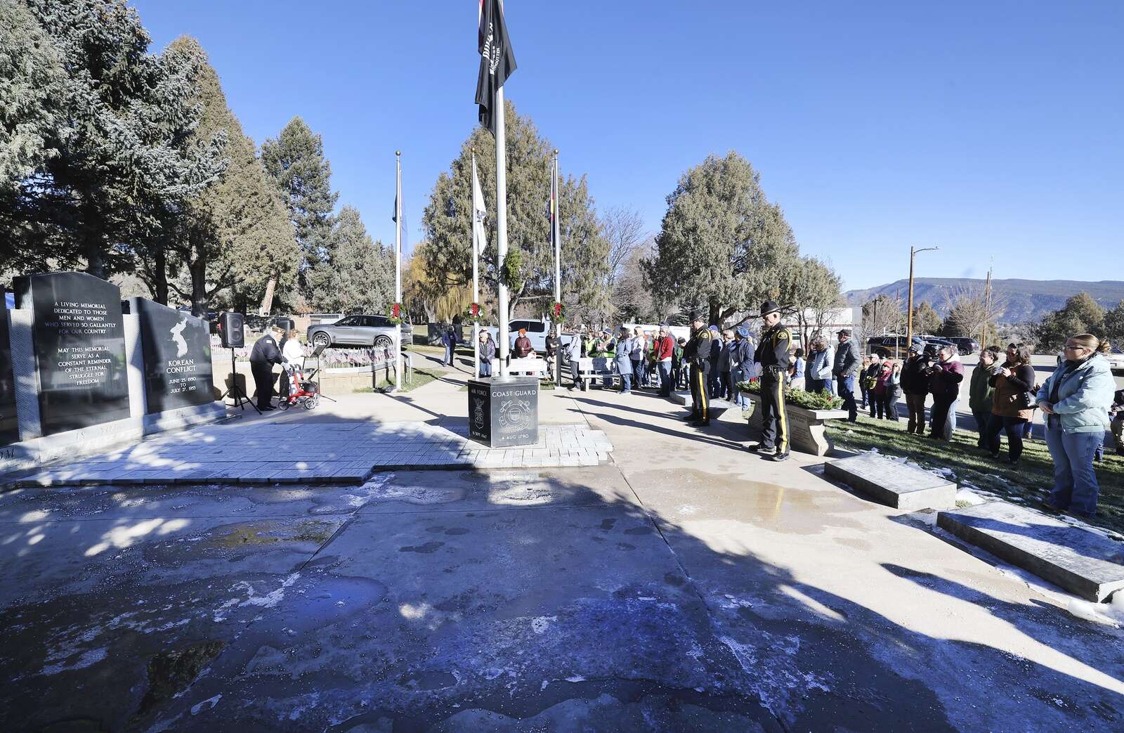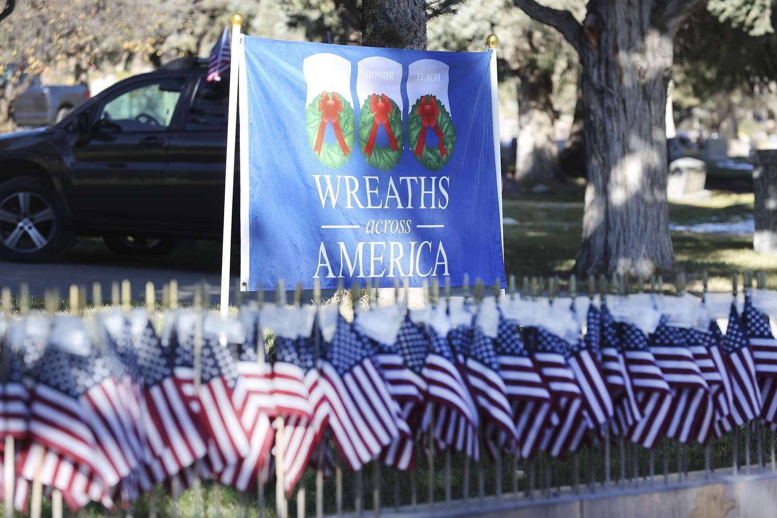 More than a hundred people attended the Wreaths Across America event Saturday at Greenmount Cemetery, which is organized by Blue Star Moms of Durango. Volunteers scattered across the cemetery placing 1,230 remembrance wreaths on the graves of fallen heroes. (Jerry McBride/Durango Herald)