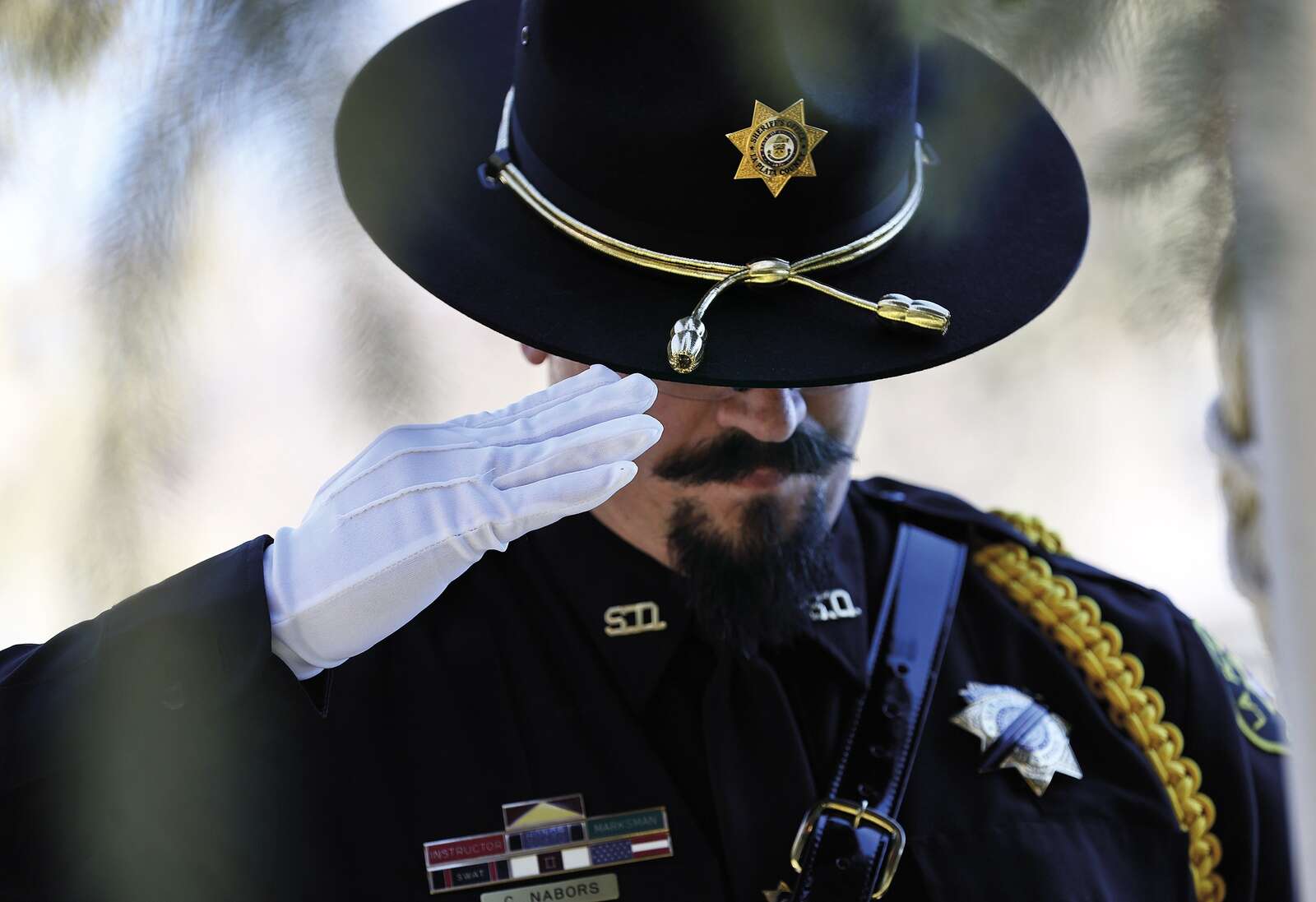 Cyrus Nabors, a La Plata County Sheriff’s Office deputy, salutes after placing a wreath at the Veterans Memorial at Greenmount Cemetery during the Wreaths Across America event on Saturday, which is organized by Blue Star Moms of Durango. Volunteers scattered across the cemetery placing 1,230 remembrance wreaths on the graves of fallen heroes. (Jerry McBride/Durango Herald)