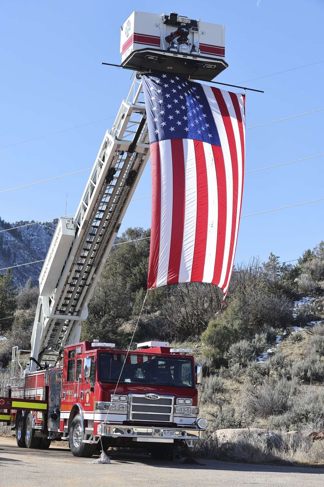 Durango Fire Protection District brought its ladder truck and a flag to the entrance of Greenmount Cemetery during the Wreaths Across America event Saturday. The event is organized by Blue Star Moms of Durango. (Jerry McBride/Durango Herald)