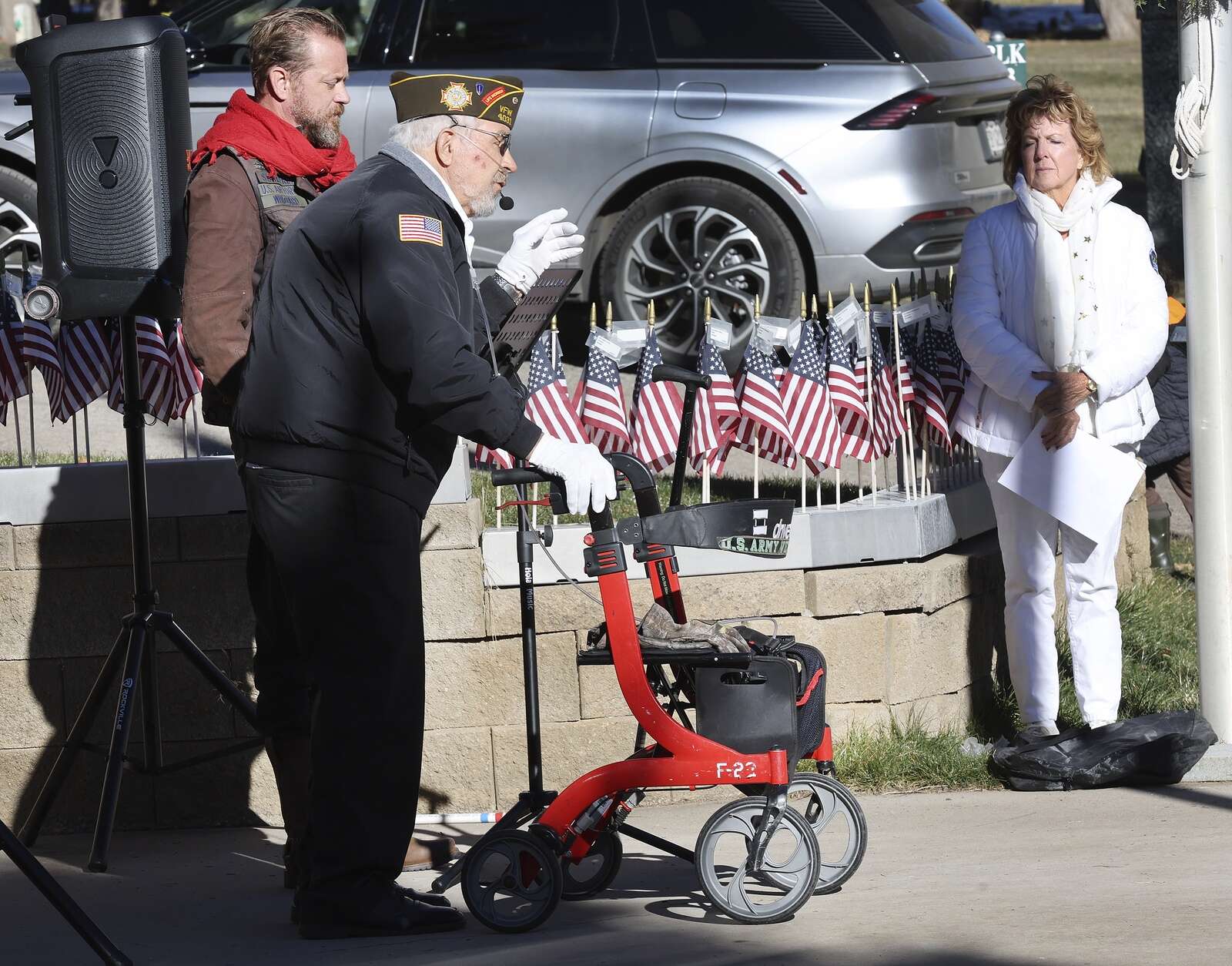 Veteran Joe Perino recites a poem as Chris Bartlett and Jill Williams listen during the Wreaths Across America event Saturday at Greenmount Cemetery. The event is organized by Blue Star Moms of Durango. Volunteers scattered across the cemetery placing 1,230 remembrance wreaths on the graves of fallen heroes. (Jerry McBride/Durango Herald)