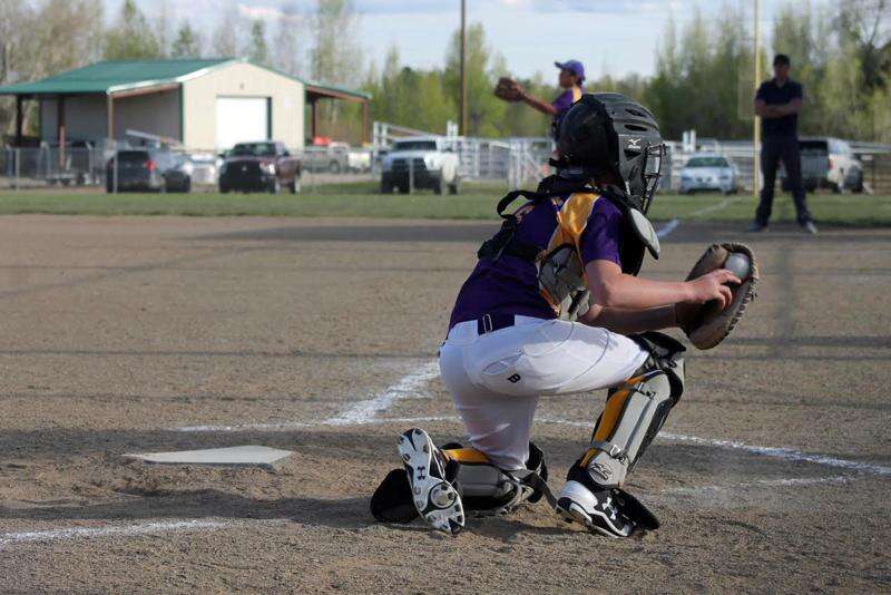 Bayfield Rockies Catcher Lance Mazur prepares to throw back a pitch.