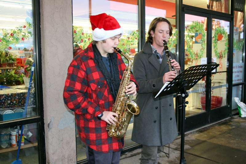 Providing some Christmas cheer during bell-ringing season at the Grocery Store are Colton Stumpf, left, and Nic Theobald. Both are members of the Bayfield High School band. They were helping the bell ringer get some solicitations on Dec. 16. Donations can be made in the Salvation Army kettles through Christmas Eve in Bayfield and Durango.