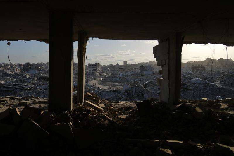 Displaced Palestinians walk amid destroyed buildings in the heavily damaged Sheikh Radwan neighborhood in Gaza City, Saturday, Oct. 11, 2025, after Israel and Hamas agreed to a pause in their war and the release of the remaining hostages. (AP Photo/Abdel Kareem Hana)