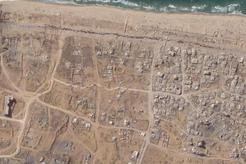 Satellite photos analyzed by The Associated Press showed a line of vehicles traveling north to Gaza City. The photos taken Saturday showed a line of vehicles on Al Rashid Street, which runs north-south along the Gaza Strip’s coastline on the Mediterranean Sea.