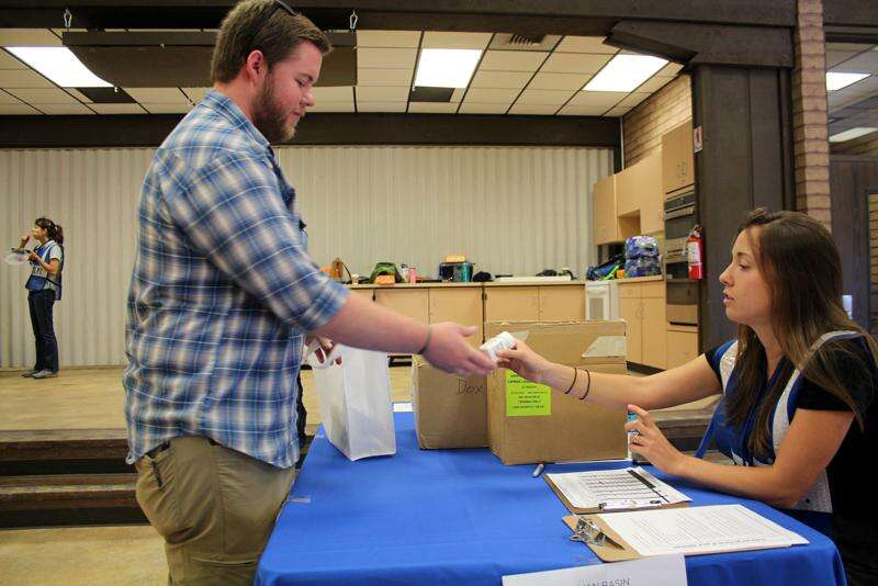Volunteers were greeted at the door and filled out a health form. If they didn't have underlying health issues, they were given an empty bottle of an antibiotic, along with instructions for dosage. The volunteers had to return the bottle to get a free lunch. Volunteers participating in the exercise also received a first-aid kit and had the chance to win door prizes.