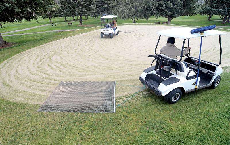 Groundskeepers Young Ghun, front, and Dave McMahon were spreading sand on Hillcrest Golf Club greens Wednesday afternoon. McMahon said they were adding sand after aerating the greens to prevent mud from developing during daily waterings. Registration for the 2013 Junior Camp No. 1, which is open to all junior golfers and takes place June 3-6, and June 10-11, will be at 2 p.m. Saturday. Juniors who need clubs for the camp can be sized at registration. For more information, call 247-1499.