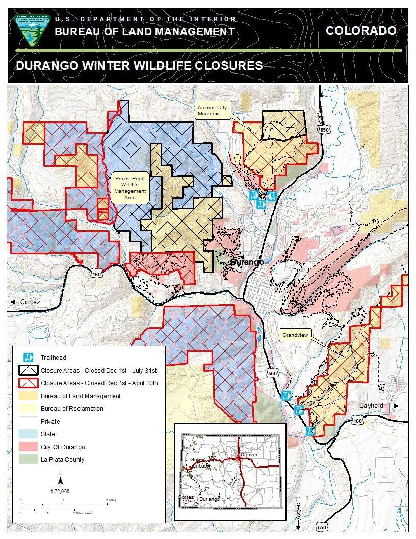 As a result, the city of Durango announced Sunday that to protect wintering wildlife, it, the Bureau of Land Management and Colorado Parks and Wildlife will close trails in their respective jurisdictions, including Grandview Ridge, Animas City Mountain, Twin Buttes, Bodo State Wildlife Area and the Durango Mesa Park downhill trails.