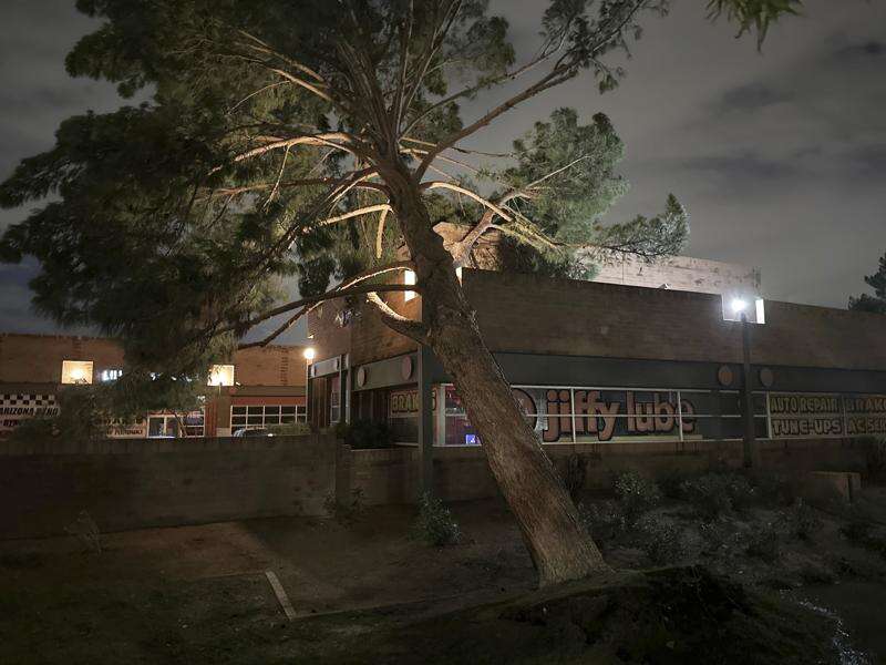In Tempe, Arizona, a microburst and thunderstorm on Monday dropped about a half-inch (1.3 centimeters) of rain within 10 minutes, the weather service said. The storm caused significant damage, including uprooting trees that toppled onto vehicles and buildings, and dropping them on streets and sidewalks. A business complex had its roof torn off, and thousands of homes lost power.