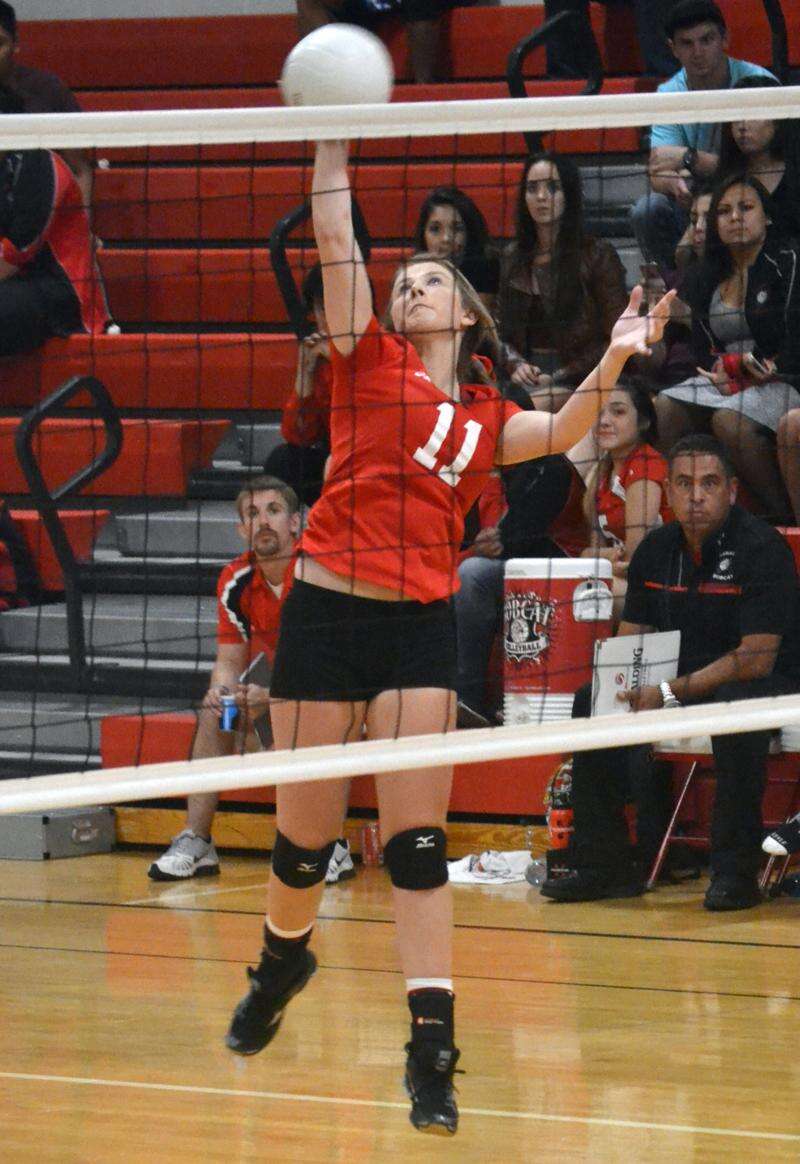 Ignacio's Alex Forsythe (11) slugs a ball during Tuesday night's season-opener inside IHS Gymnasium versus 3A Montezuma-Cortez. The action was back-and-forth, but in the end the Volleycats fell in five-25-17, 19-25, 28-26, 17-25, 8-15-to the non-league visitors.