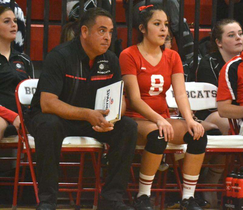 Ignacio varsity head coach Thad Cano and freshman newcomer Makayla Howell (8) intently observe Tuesday night's season-opening action versus 3A Montezuma-Cortez inside IHS Gymnasium. Up next for IHS will be a Sept. 8 trip out to Dove Creek, beginning 2A/1 San Juan Basin League play. Telluride then comes to town for an 11 a.m. start on Sept. 10.
