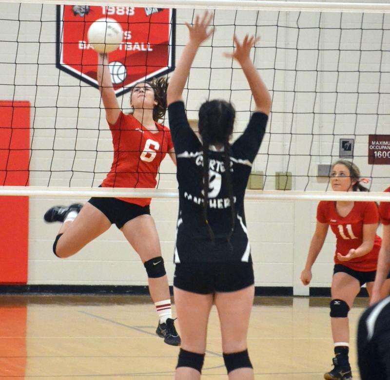 Ignacio's Ryley Webb (6) leaps into a back-row attack during Tuesday night's season-opener inside IHS Gymnasium versus 3A Montezuma-Cortez.