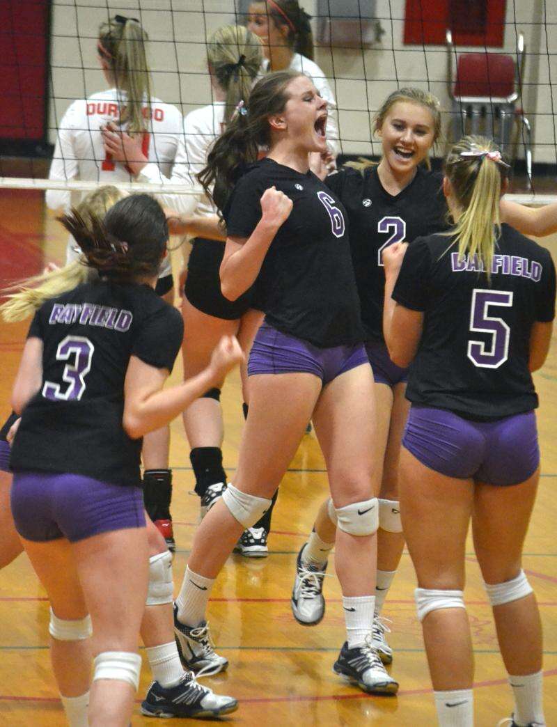 Bayfield's Kylee McCoy (6) leads a celebratory roar along with Ashley Mottin (2) during Tuesday night's road win in Durango. The win in three games helped Bayfield make up for the 15-6 football loss to Durango on Sept. 23.