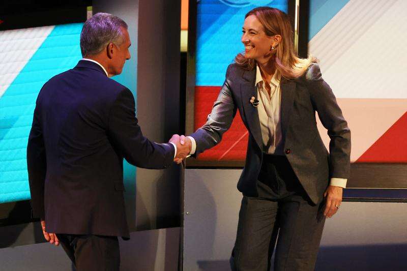 Republican Jack Ciattarelli, left, looks on while Democrat Mikie Sherrill speaks during the final debate in the New Jersey governor's race, Wednesday, Oct. 8, 2025, in New Brunswick, N.J. (AP Photo/Heather Khalifa)