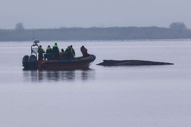The whale was a bit more active after rescuers left, “but it is not activity that gives us grounds for hope,” Baschek said at a televised news conference. “We firmly believe that the animal will die there.”